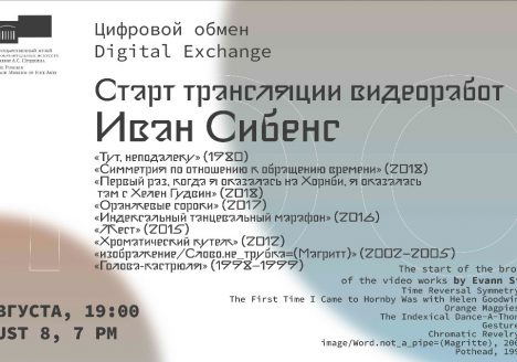 EVANN SIEBENS 100 Ways to Live a Minute Pushkin State Museum of Fine Arts Moscow, Russia New video work to be presented every Saturday STARTING SAT, AUG 8, 2020 A survey online presentation featuring 8 video…