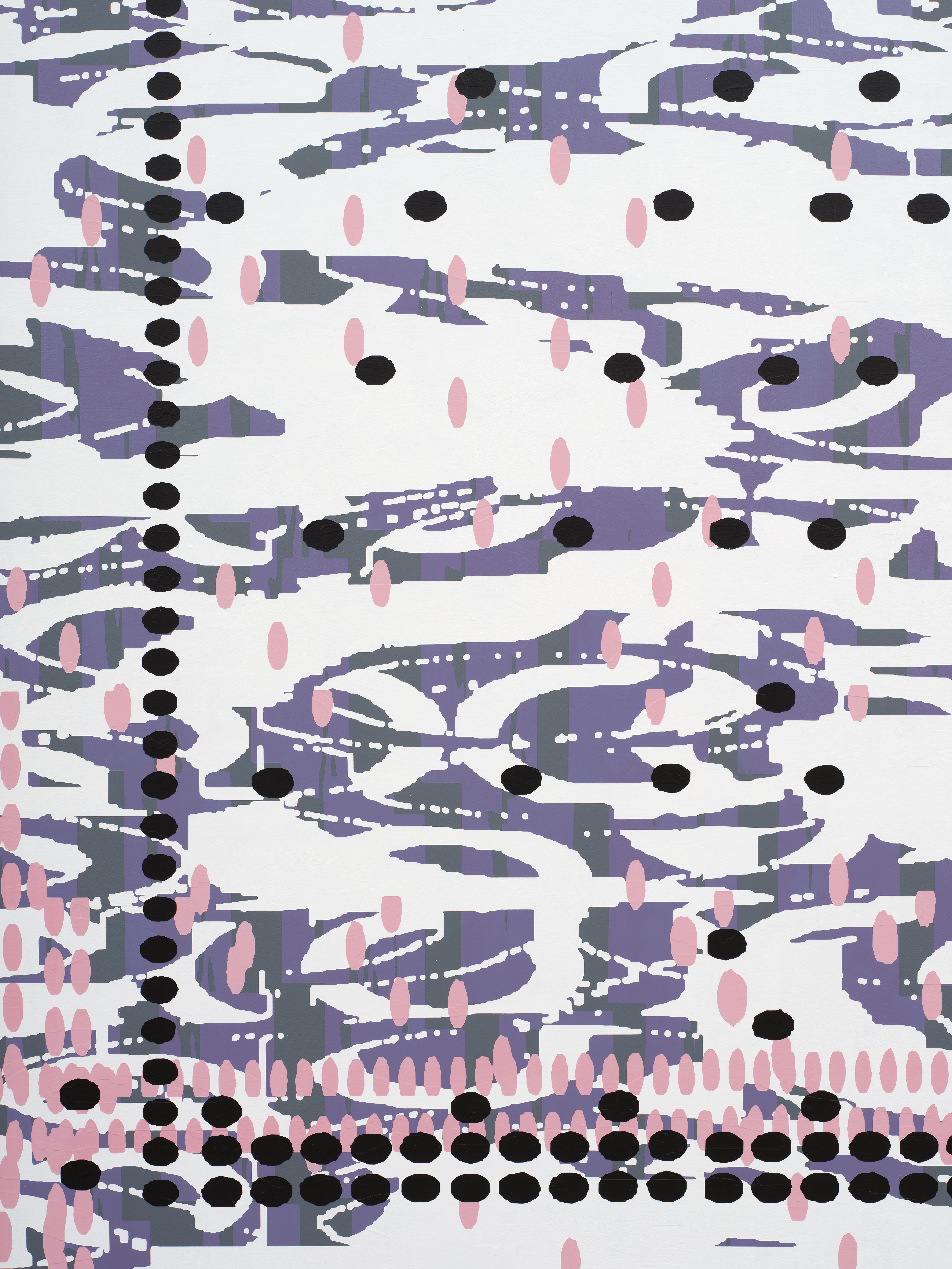 1. Heilbron’s paintings repeat a four-petalled flower grid. 1. Translated between computer programs and then onto the canvas by Heilbron’s hand, the grids stretch and warp, frayed by pixelation and slippage.