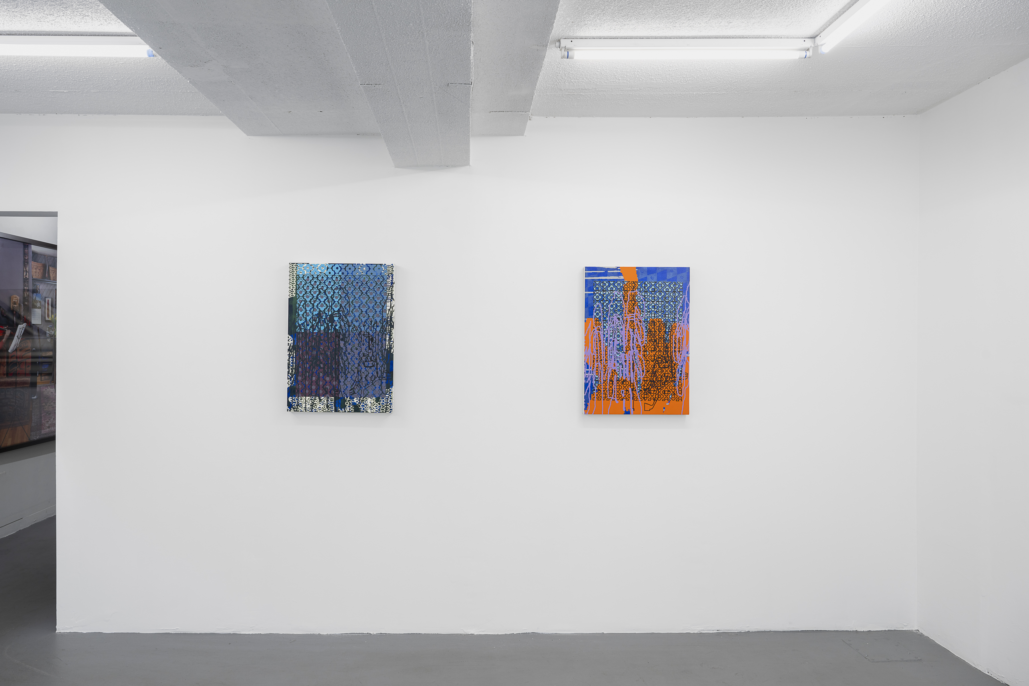 1. In three larger paintings rows of opaque circles and patches of glitch interrupt the grid. 1. The painted grid is woven, like brocade cloth, with the ordered density of a motherboard.