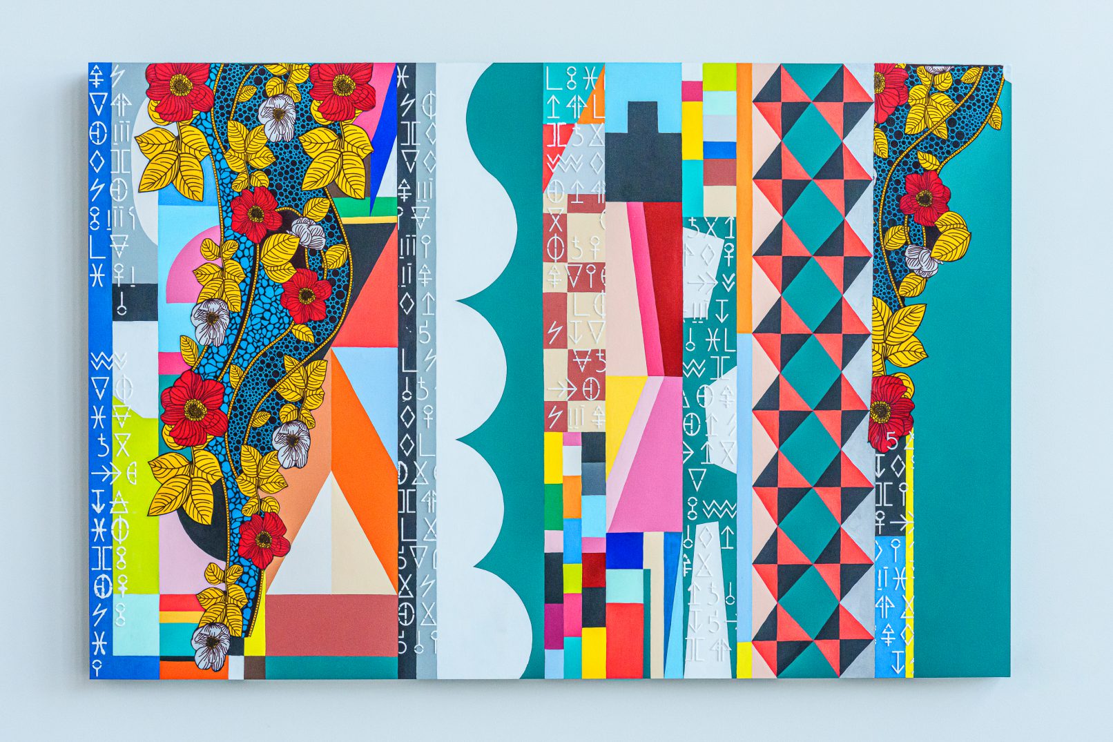 French-born artist Ghislain Brown-Kossi weaves together an understanding of pattern and communication through symbols in relief, painting references to ancestral African patterns which are iterated, commodified, and integrated into contemporary society. With a background in fashion, Kossi uses bold colours and repetition to define the materiality of textile as language, investigating cultural opacity through textural legibility.