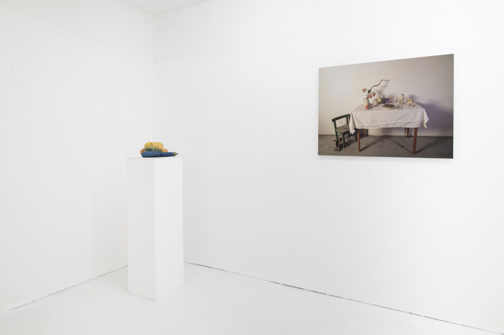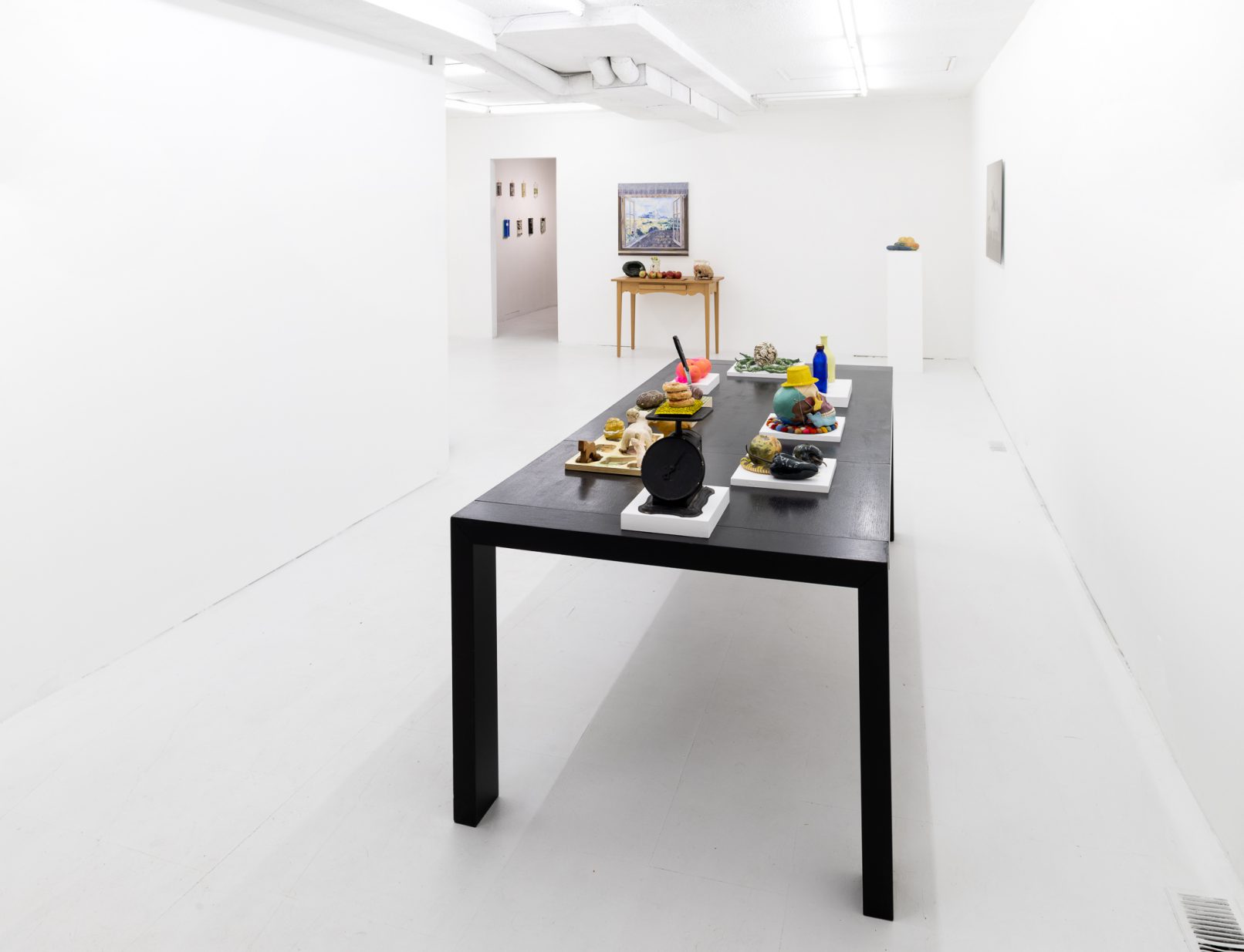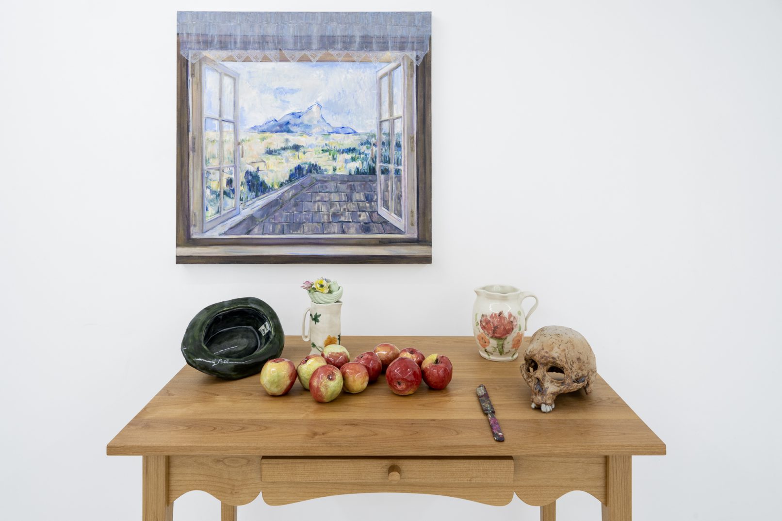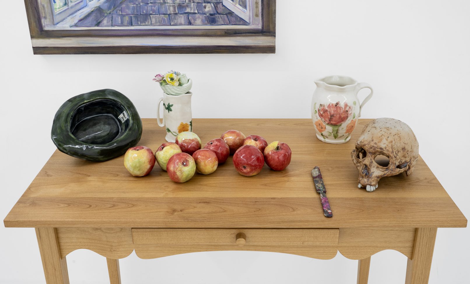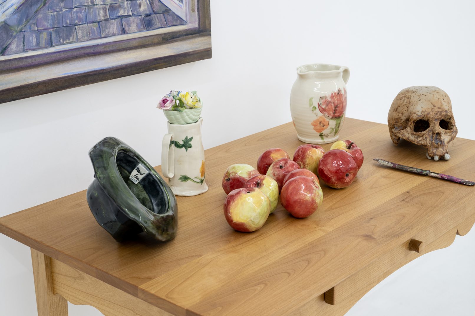 “My practice from 1961 to 2023 – 63 years – has involved a broad palette of materials and forms. In this present exhibition I was interested in using a painting genre – still life or nature morte – but making objects in ceramics along with found things, and presenting them in still life as photographs. They involved research, combining historical information, drawing on famous still life paintings by European artists of the 17th century, as well as by the modern painters, such as Paul Cézanne, but reflecting the realities of contemporary art and the present historical moment. Holbein’s Renaissance painting, The Ambassadors, a portrait of two men within a still life painting who were reputed to be lovers or “married”, carries a number of secrets and messages within the assemblage of objects. Cézanne and Morandi kept a collection of pottery, skulls, small sculptures, furniture, and other objects as “props” that they used repeatedly in their still life paintings, providing a physical vocabulary to construct narratives. I liked this as an exploration of techne in contemporary life by creating, in addition to the photographs, small still life using the same “props” or objects. I have worked on this project, that was supported by a Canada Council grant, for almost three years now.”