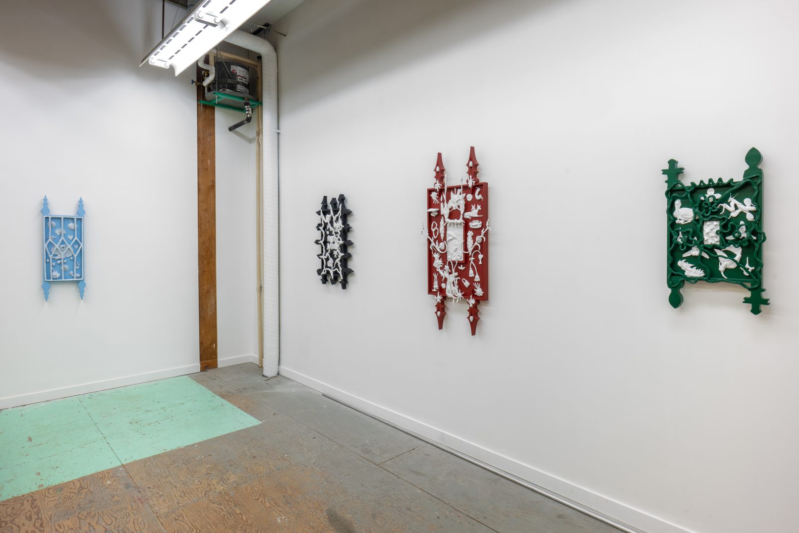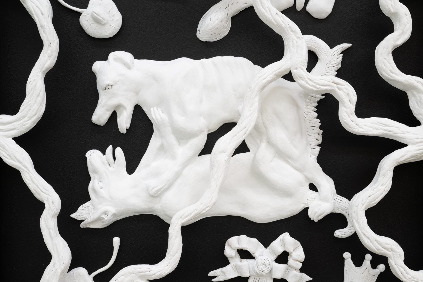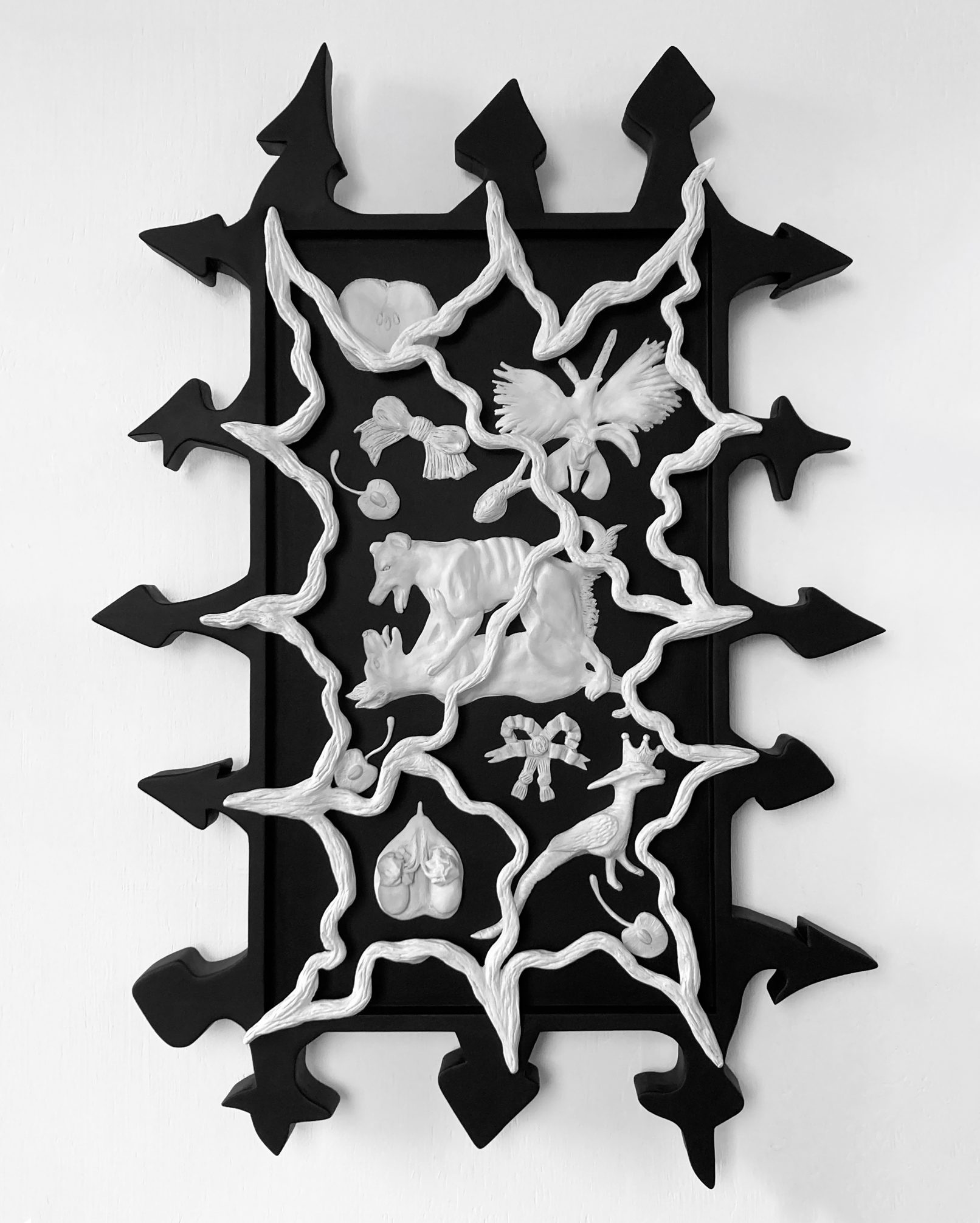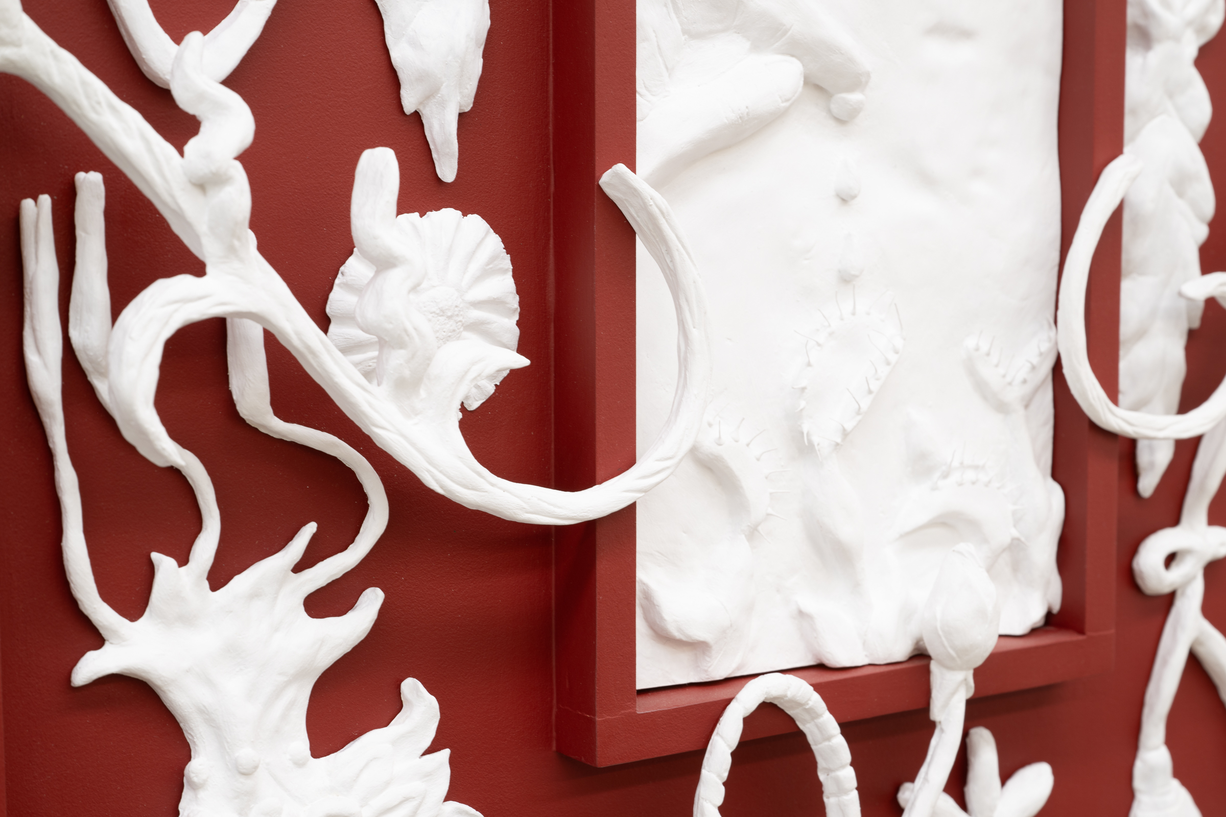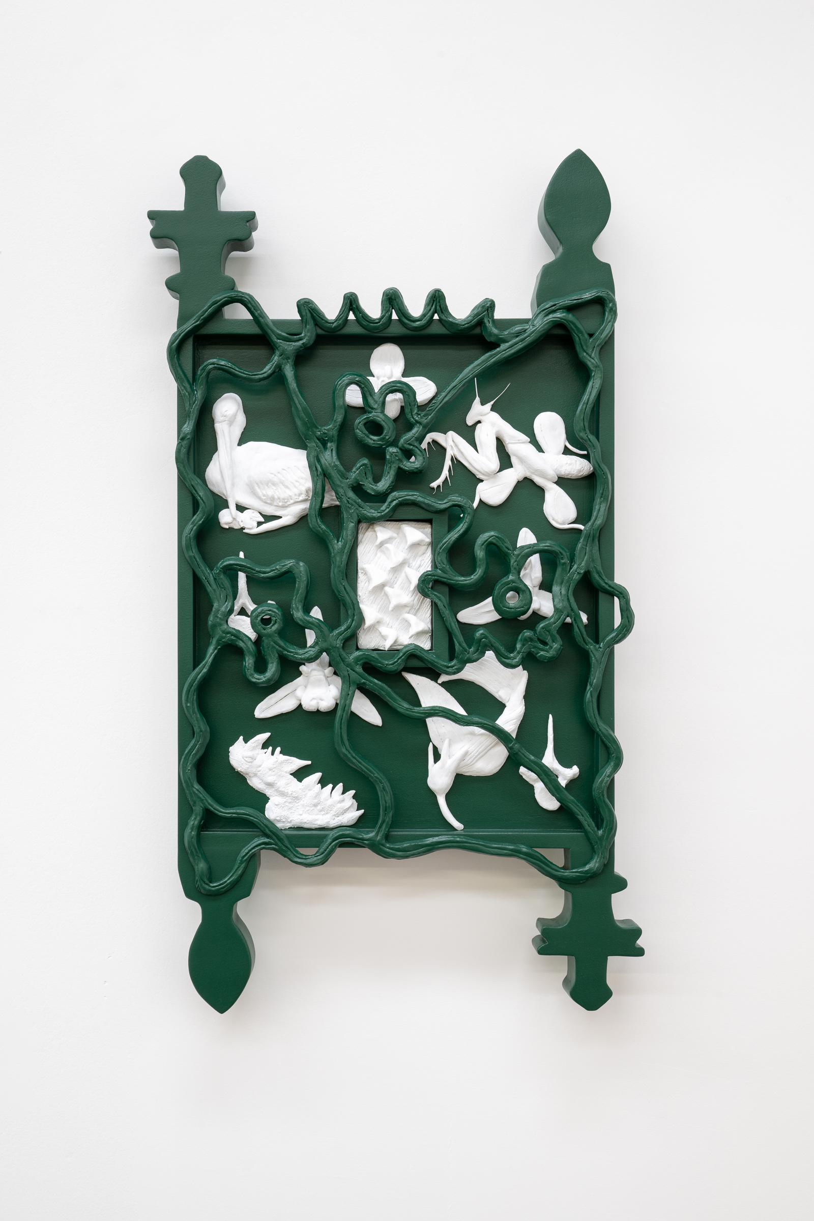 This mix of biological miscellany reimagines traditional motifs and decorative moldings, departing from established patterns of repetition and order. Instead, Somjen’s chaotic and perplexing arrangements allude to disorder, rejecting the romanticized notion of nature as idyllic. While elaborate, the handcrafted sculptures possess a “blocky” quality, appearing neither old nor new, serving as protective emblems of our present moment, reminiscent of coats of arms or shields.