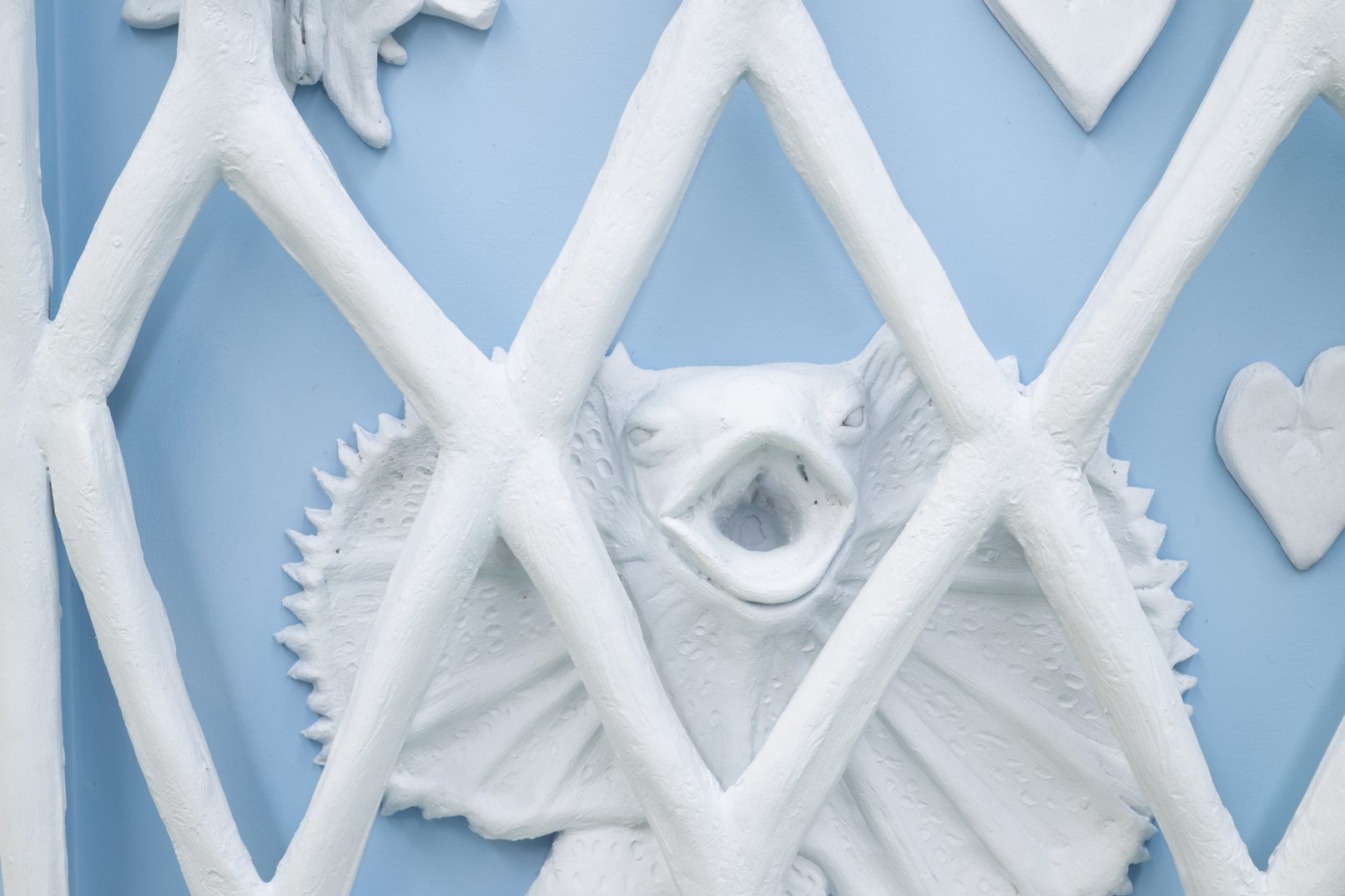 Spines consists of four decorative frames, each adorned with wooden finials and a diverse array of motifs that serve a tripartite function: enhancing the ornamental quality of the sculptures, engaging with tropes of natural history and medieval symbolism, and evoking skeletal or calcified representations of both plant and animal anatomy. Within this work, significant motifs such as dogs, orchids, poisonous plants, vertebrae, biomimetic flora, and birds emerge, often depicted in defensive postures. The work creates frames within frames, forming a clear focal point or centrepiece reminiscent of cameo carvings. These centrepieces include a disembodied hand feeding blood to a Venus flytrap, two dogs fighting, a lizard in a defensive pose, and the scales and prickles of the pinecone of Methuselah—the bristlecone pine tree, the longest-living organism on the planet.