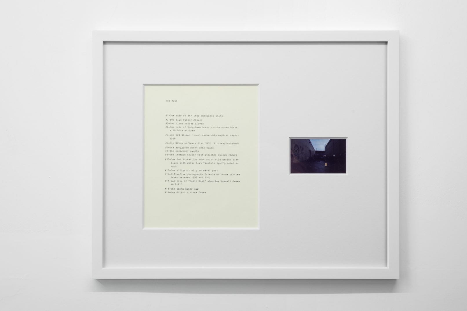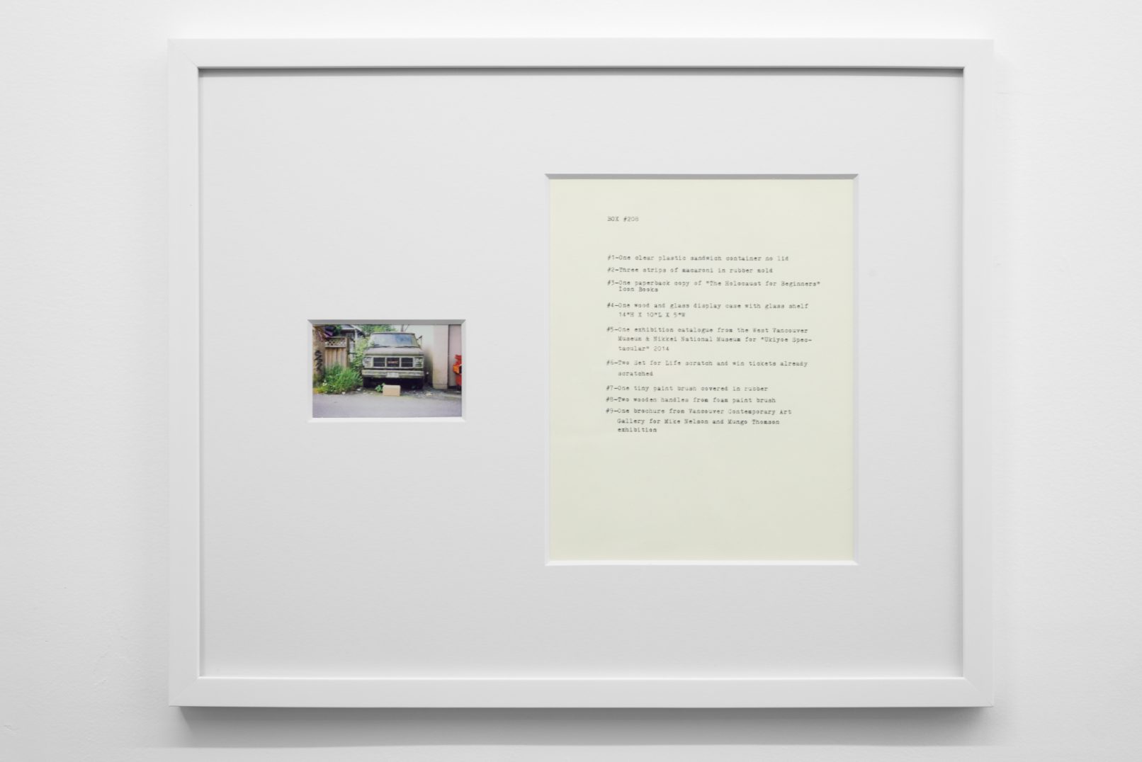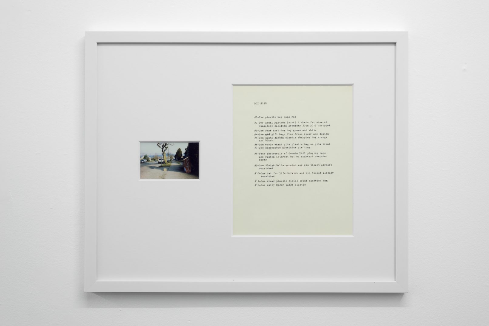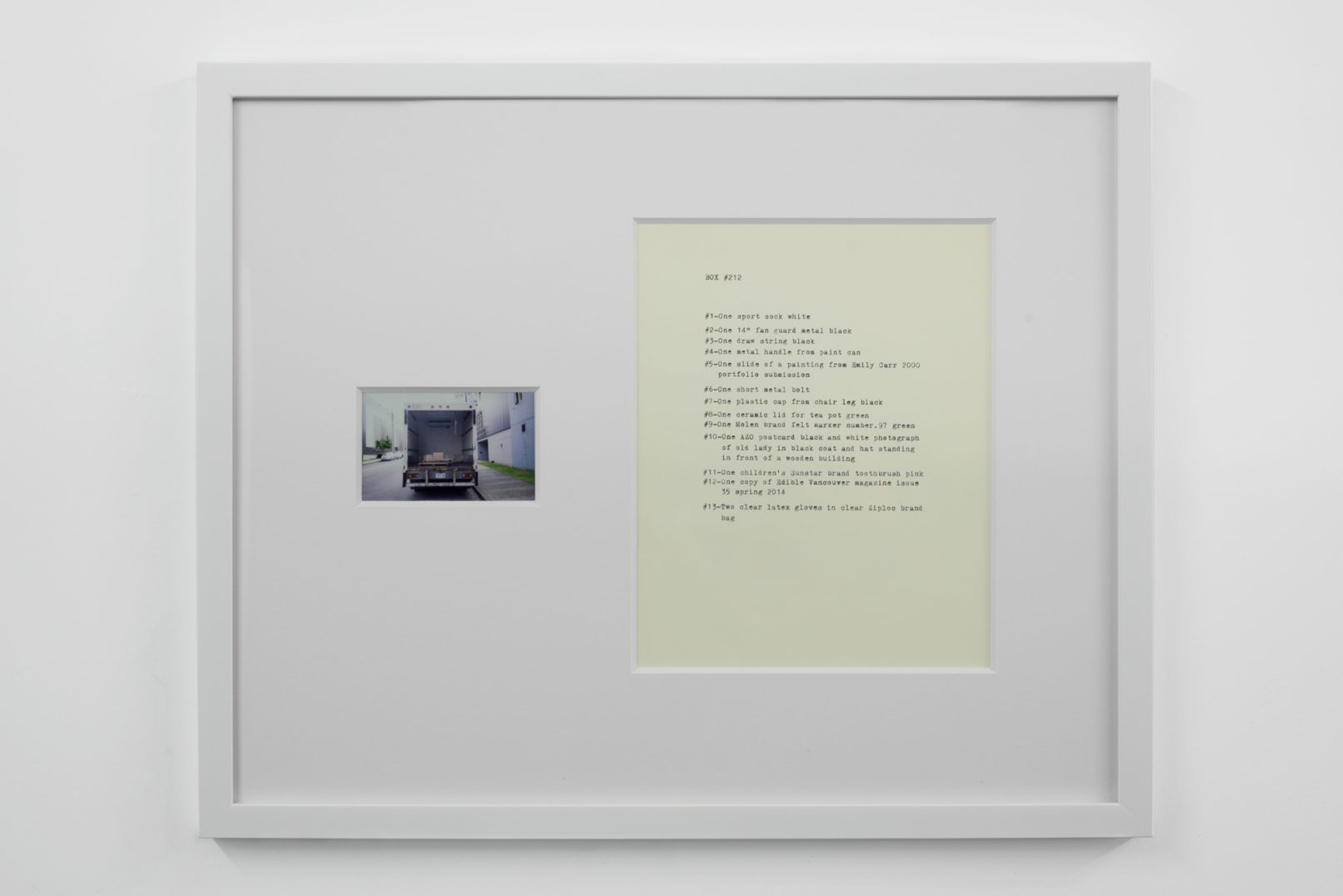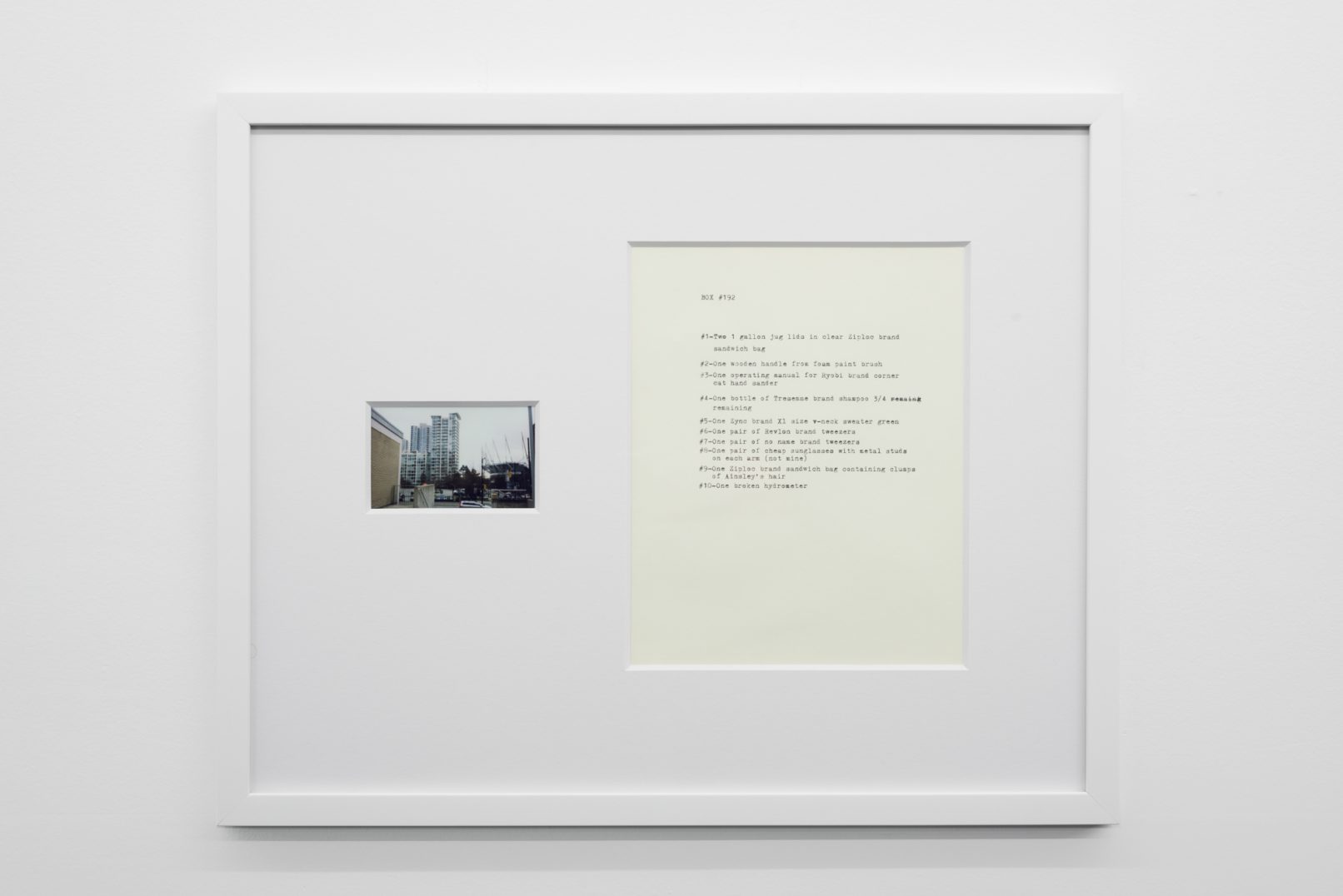 The Box Project comprises a series of photographs of boxes of possessions left behind by the artist in the streets and alleys of Vancouver, which are often dismal settings in direct contrast to the city’s “picturesque” reputation. Each photograph is paired with a typewritten list of the hoarded objects found within the discarded box it pictures. The series both informs the aesthetic of Quast’s sculptural paint works and investigates the artist’s compulsion to dump his personal possessions in this manner. The cumulative effect of these photographs is to illustrate scenes at the fringes of society; the box can be read as a visual metaphor of the experience of economic decline or social coldness experienced in downtrodden areas across many North American cities.