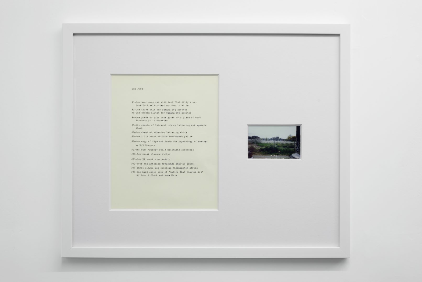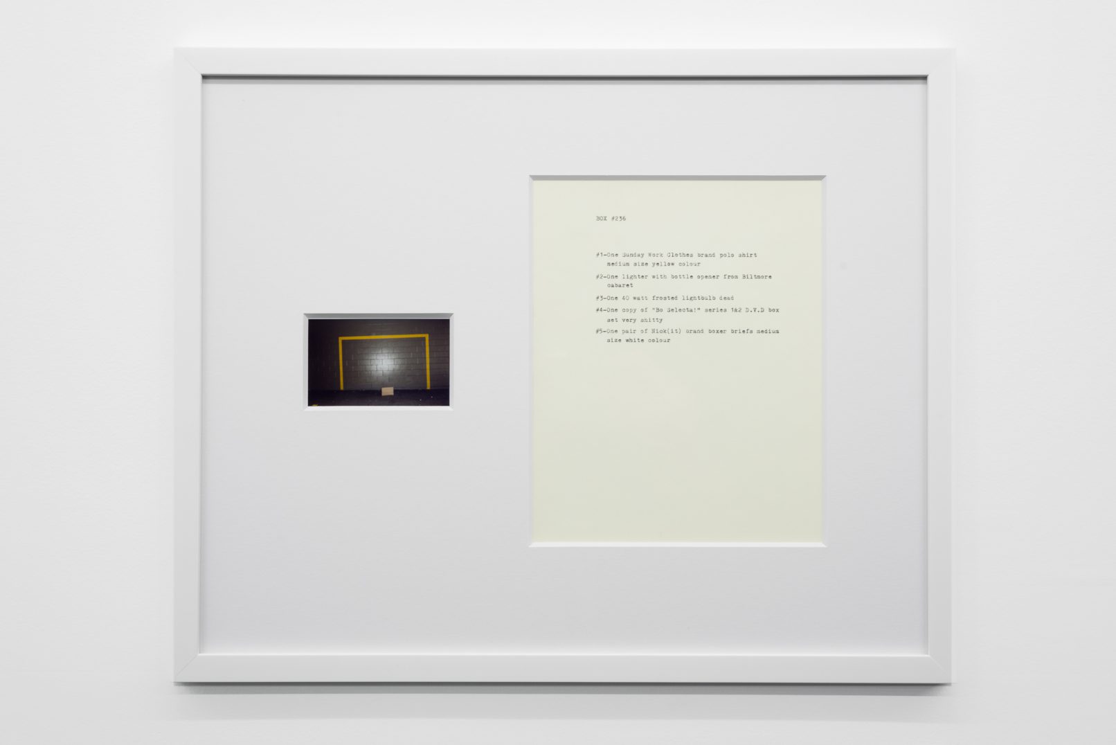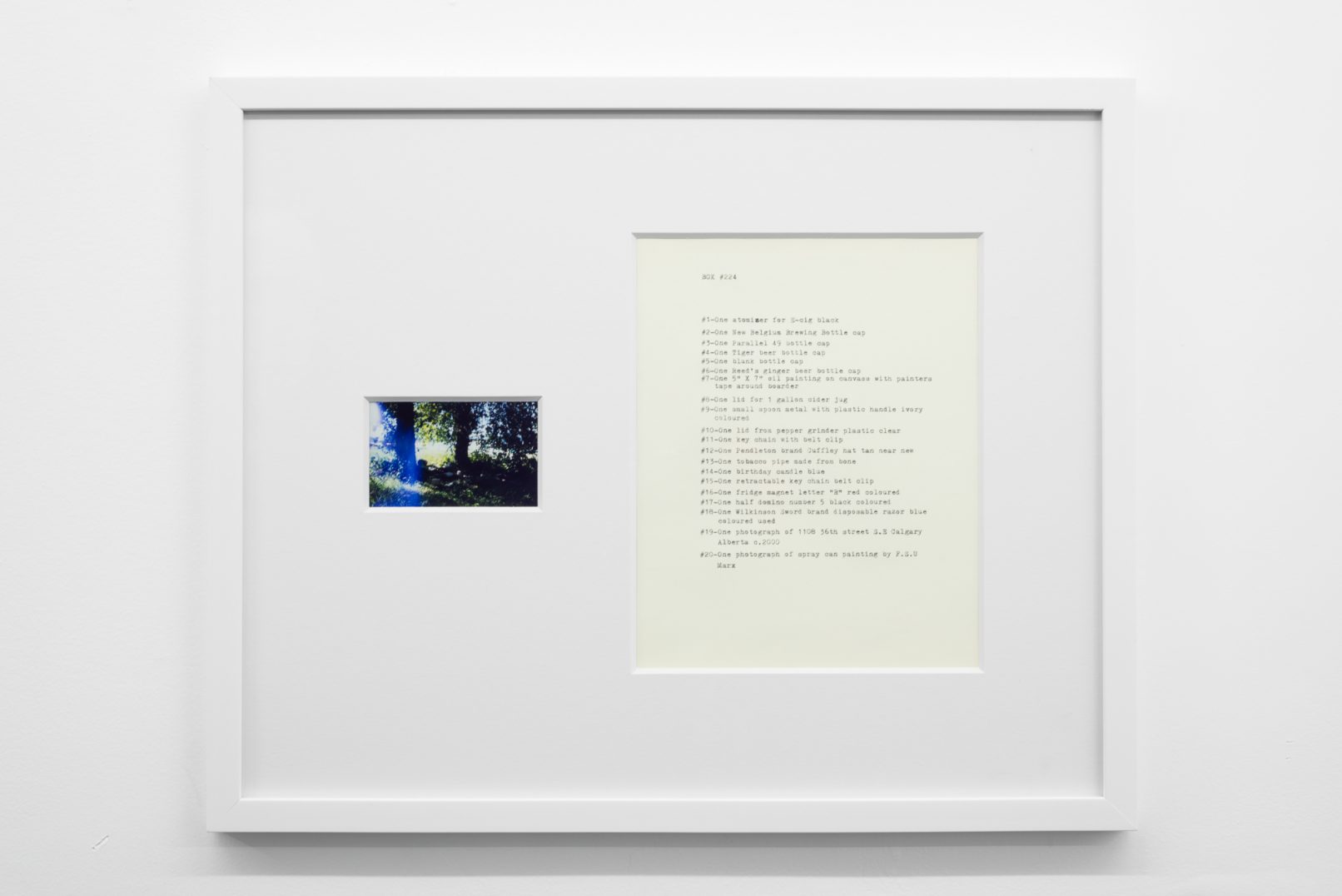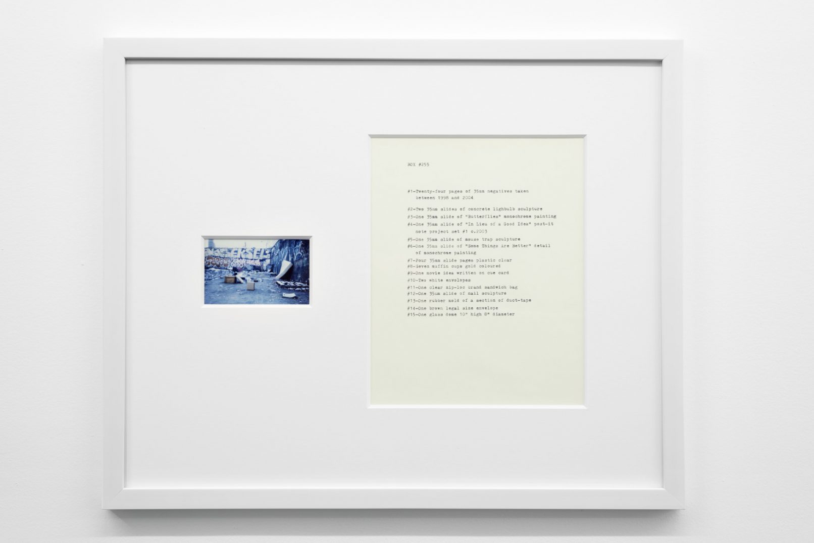 The Box Project comprises a series of photographs of boxes of possessions left behind by the artist in the streets and alleys of Vancouver, which are often dismal settings in direct contrast to the city’s “picturesque” reputation. Each photograph is paired with a typewritten list of the hoarded objects found within the discarded box it pictures. The series both informs the aesthetic of Quast’s sculptural paint works and investigates the artist’s compulsion to dump his personal possessions in this manner. The cumulative effect of these photographs is to illustrate scenes at the fringes of society; the box can be read as a visual metaphor of the experience of economic decline or social coldness experienced in downtrodden areas across many North American cities.