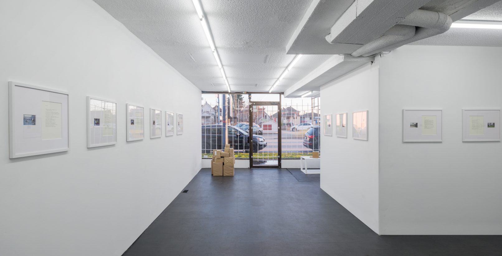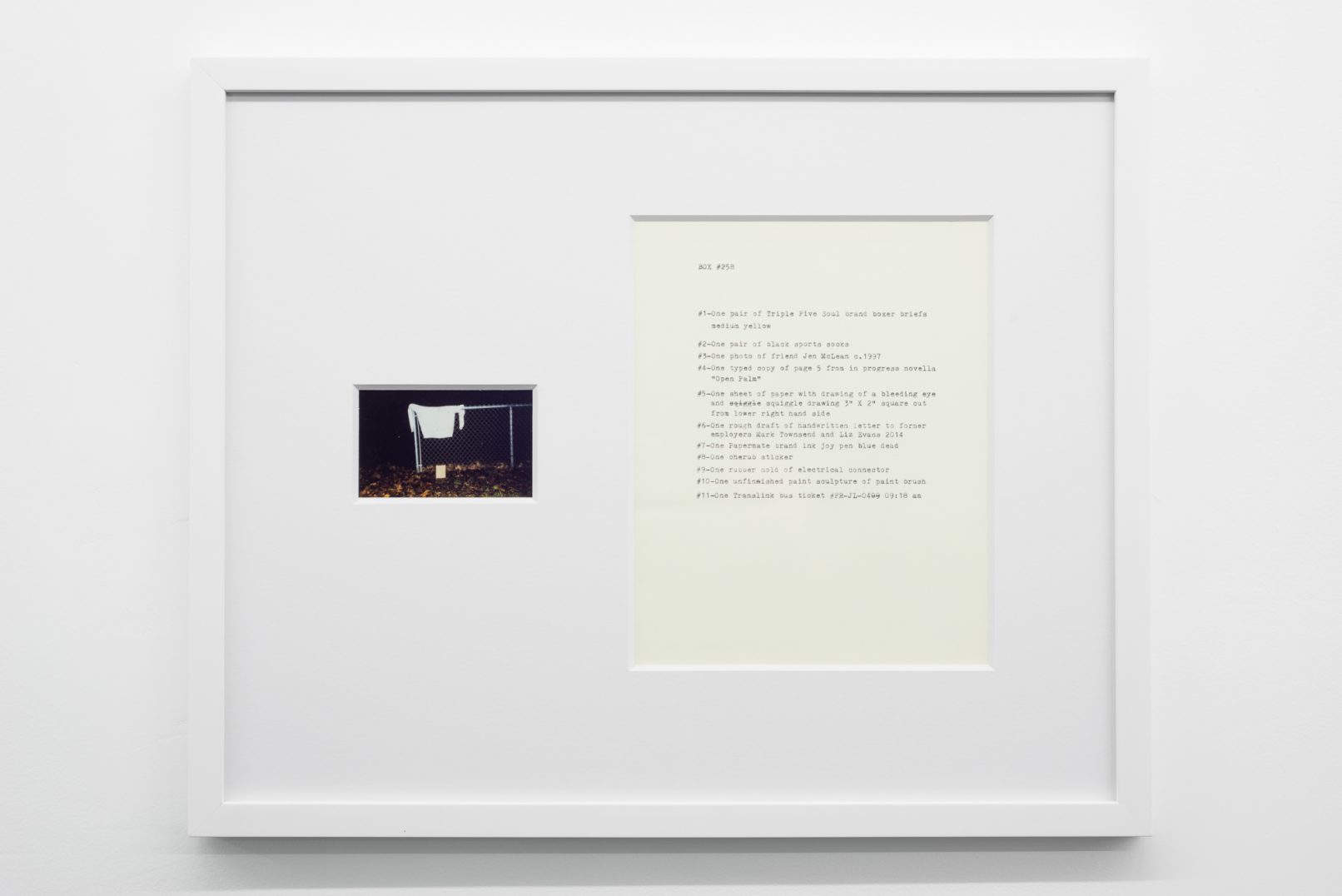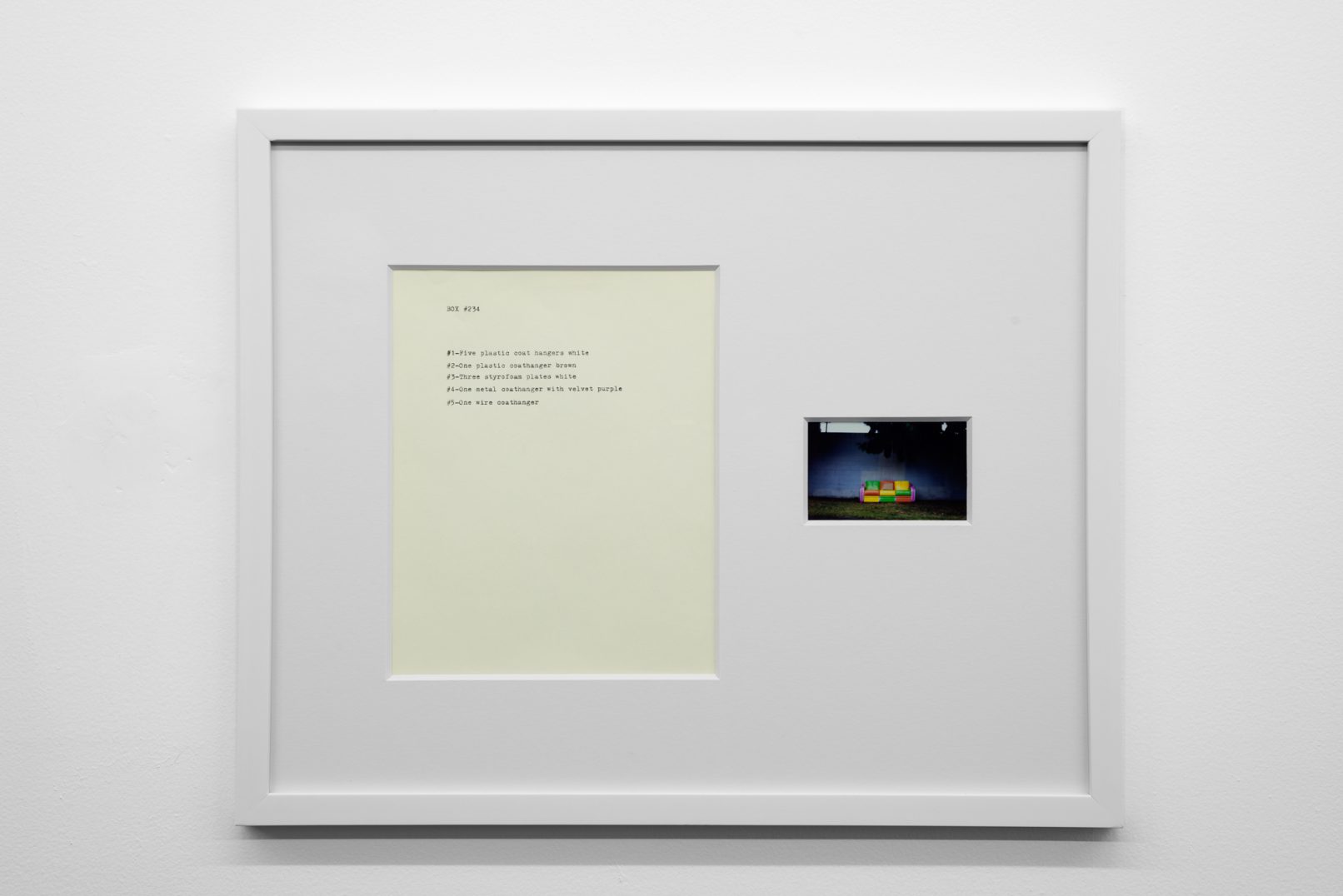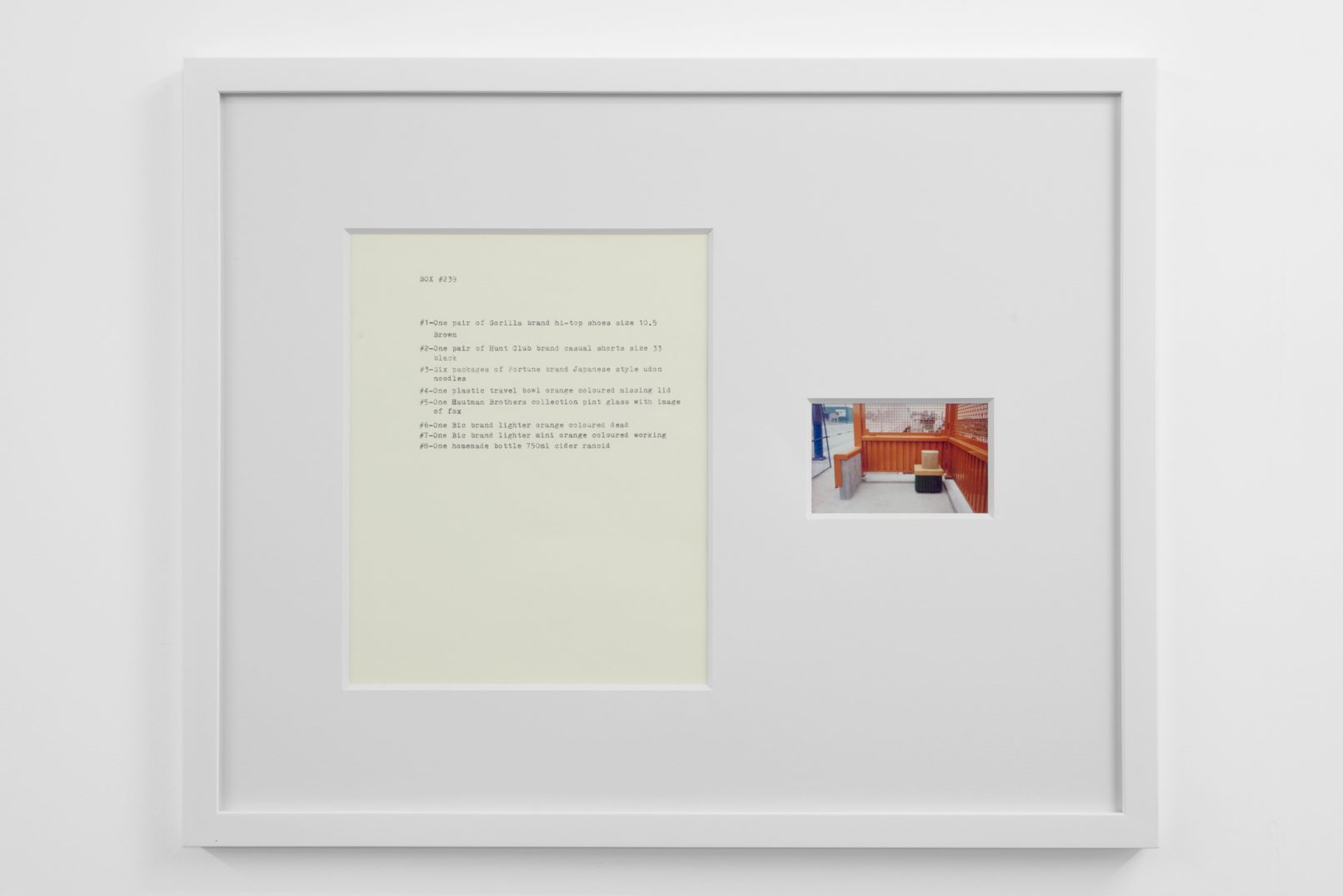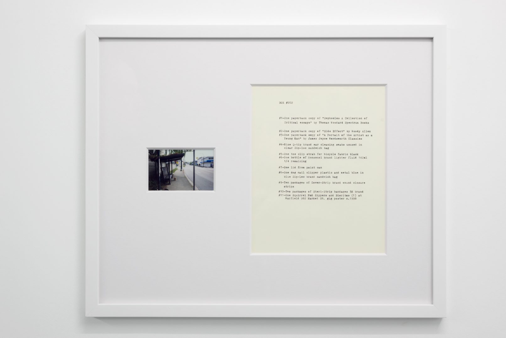 The Box Project comprises a series of photographs of boxes of possessions left behind by the artist in the streets and alleys of Vancouver, which are often dismal settings in direct contrast to the city’s “picturesque” reputation. Each photograph is paired with a typewritten list of the hoarded objects found within the discarded box it pictures. The series both informs the aesthetic of Quast’s sculptural paint works and investigates the artist’s compulsion to dump his personal possessions in this manner. The cumulative effect of these photographs is to illustrate scenes at the fringes of society; the box can be read as a visual metaphor of the experience of economic decline or social coldness experienced in downtrodden areas across many North American cities.