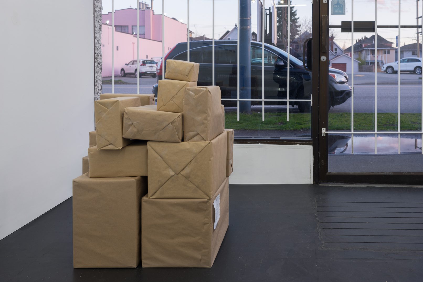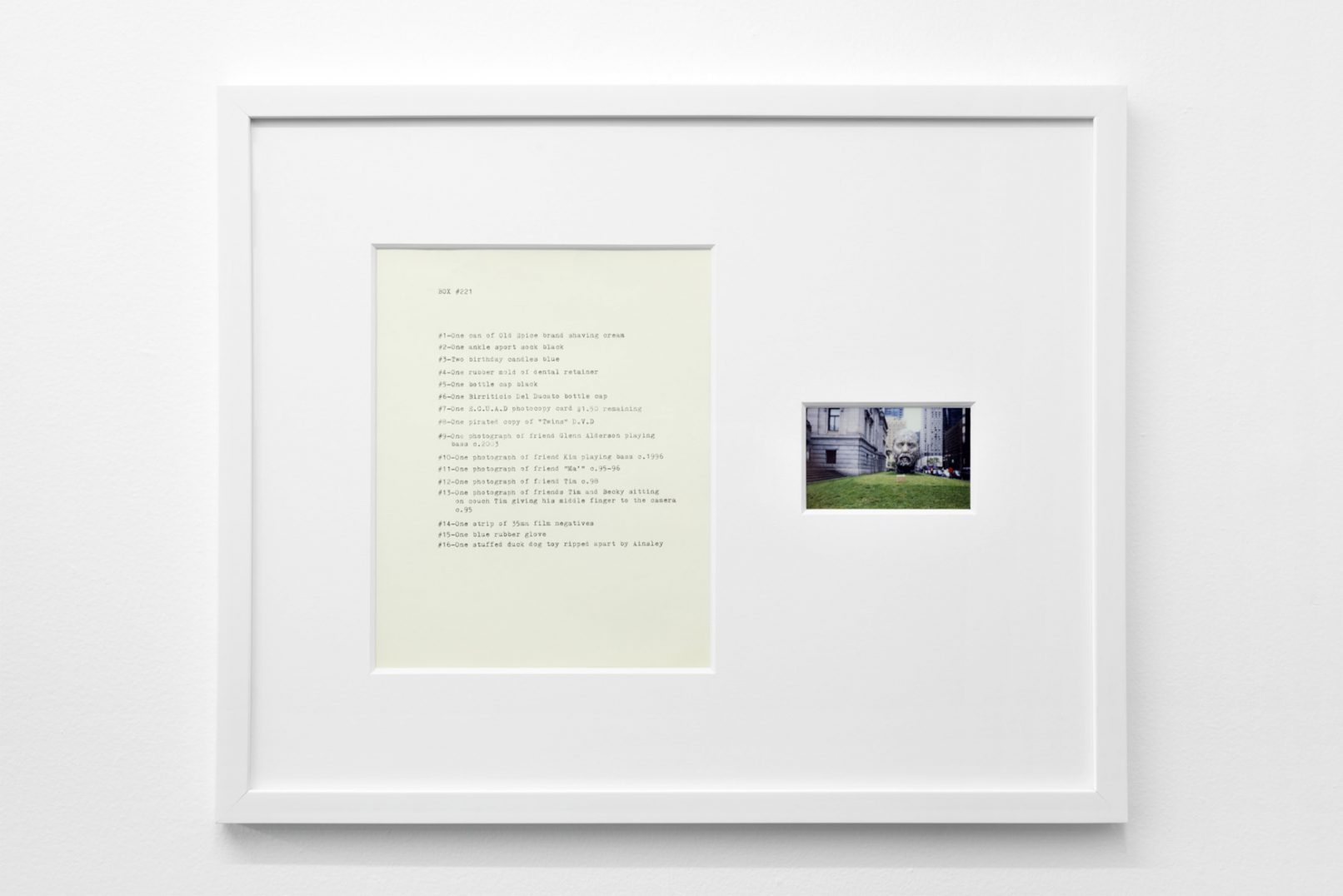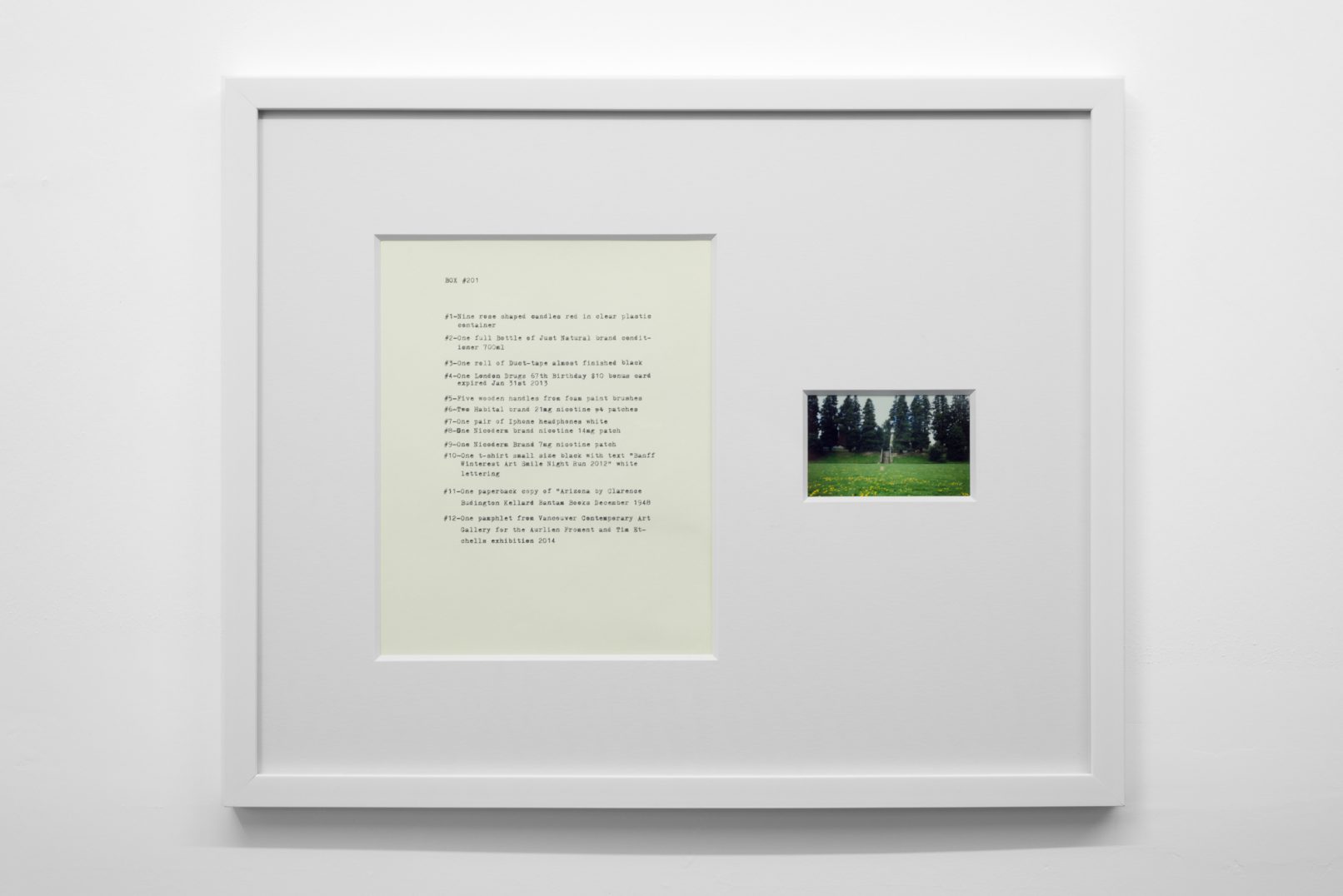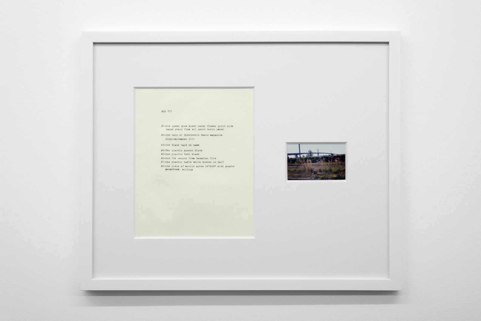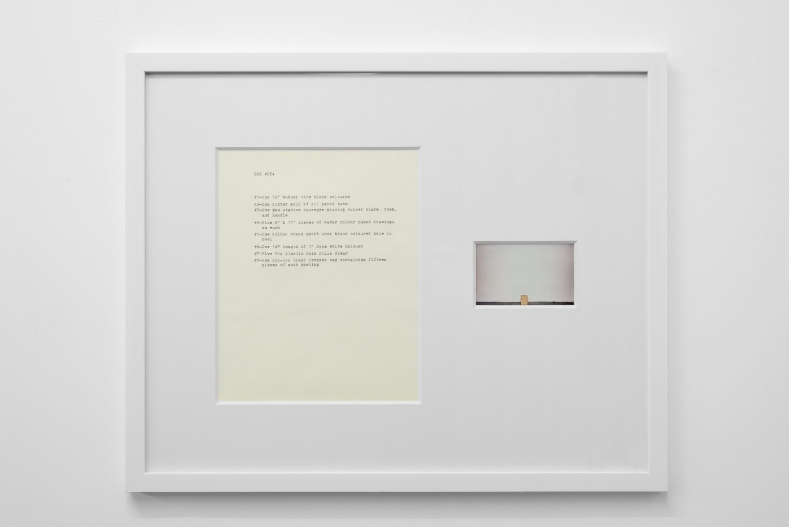 The Box Project comprises a series of photographs of boxes of possessions left behind by the artist in the streets and alleys of Vancouver, which are often dismal settings in direct contrast to the city’s “picturesque” reputation. Each photograph is paired with a typewritten list of the hoarded objects found within the discarded box it pictures. The series both informs the aesthetic of Quast’s sculptural paint works and investigates the artist’s compulsion to dump his personal possessions in this manner. The cumulative effect of these photographs is to illustrate scenes at the fringes of society; the box can be read as a visual metaphor of the experience of economic decline or social coldness experienced in downtrodden areas across many North American cities.