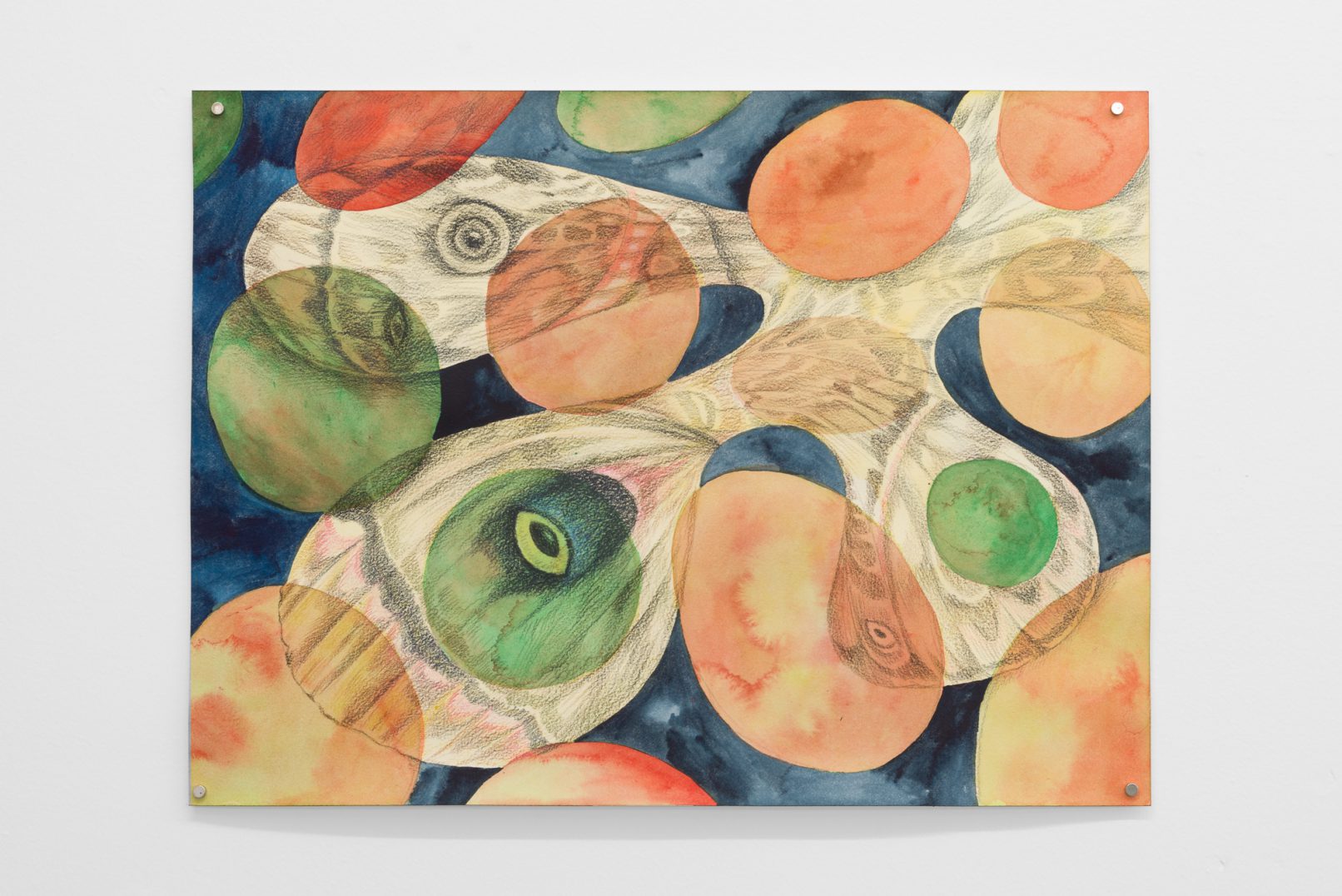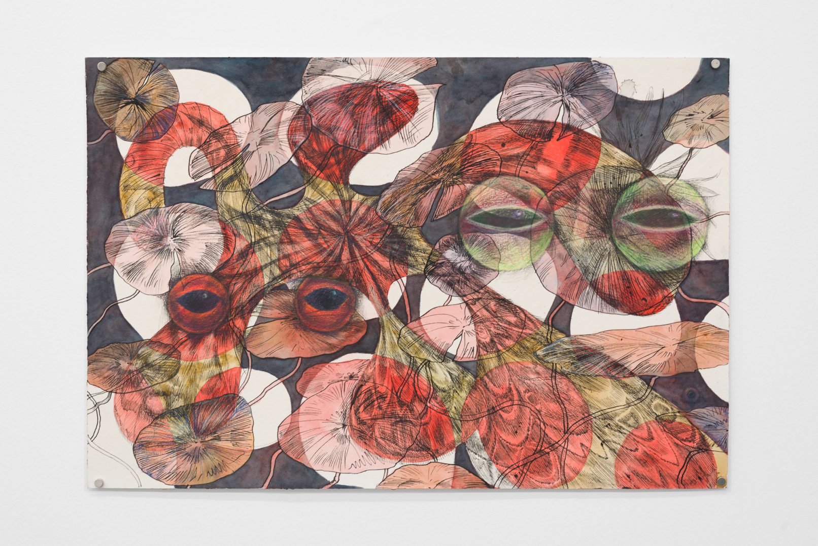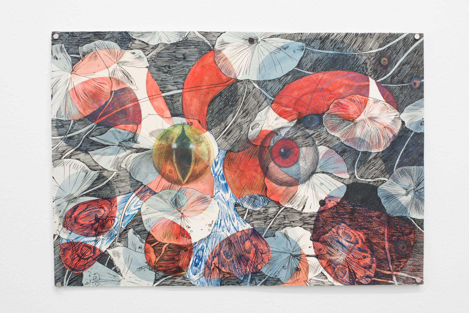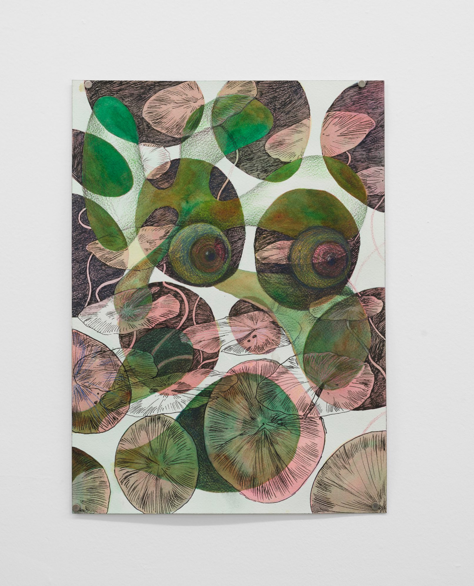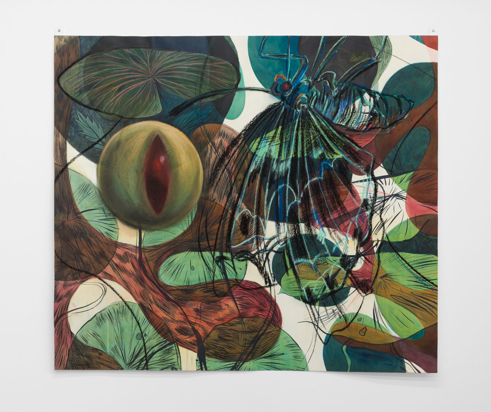 In Swamp Sight, Davidson weaves a world of uncanny connections around the act of looking. Frog, moth, and human eyeballs all appear to regard the viewer and each other. Drawn partly from observation, these works depart from natural history illustration to swim towards a strange new form of camouflage. A question floats among the forms: who’s seeing who, and how?