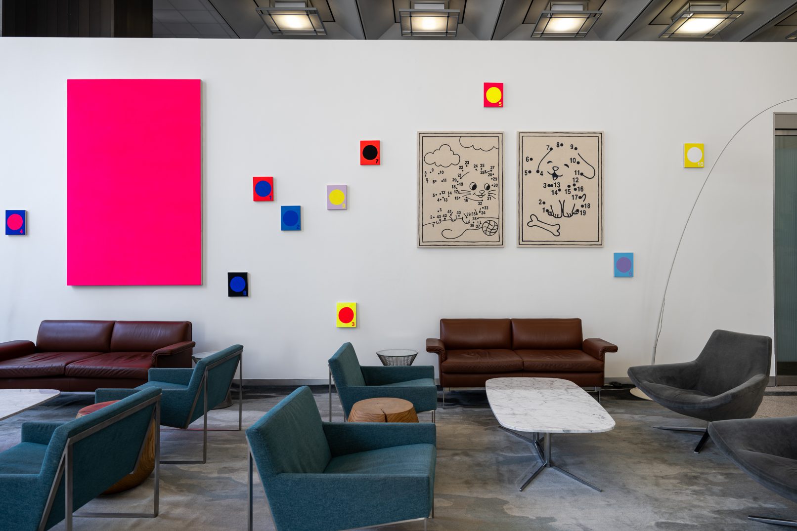 The exhibition also features an installation of ten dichromatic paintings, each rendered in optically-charged colour pairs. These paintings, displaying circles with the numbers 1, 2, 3, 4, 5, 6, 7, 8, 9, 10, collectively form a large-scale abstraction. Like “Cat” and “Dog,” these paintings encourage viewer participation, asking the audience to mentally connect the dots across canvases, dissolving the paintings into an invisible composition within the viewer’s mind. This interaction transforms the viewing experience from passive observation to active creation, emphasizing the collaborative nature of perception, imagination and painting’s innate agency.