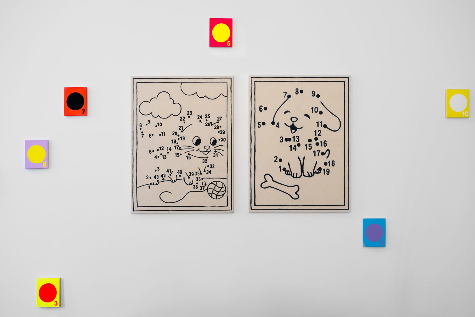 A diptych of paintings, titled “Cat” and “Dog”, uses the playful imagery of children’s connect-the-dot drawings. The choice to leave the images incomplete invites viewers to engage with the paintings, to complete the figures mentally and thus become collaborators in the compositional process.