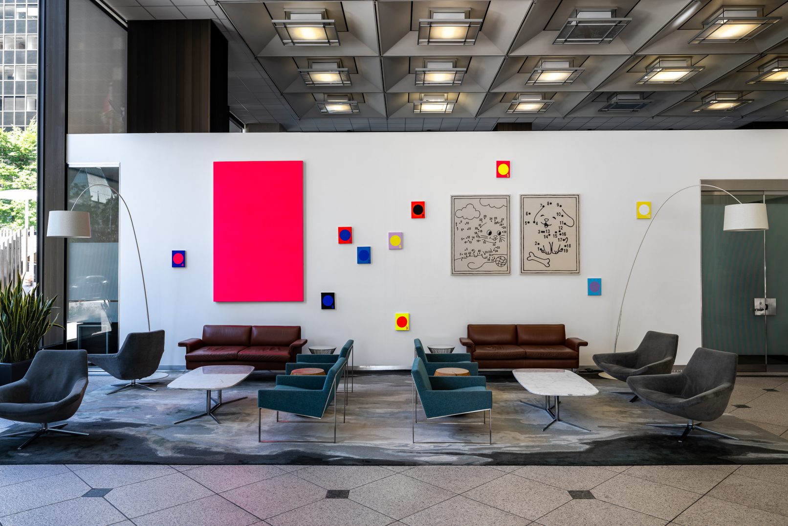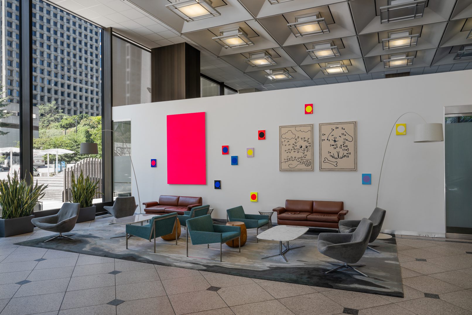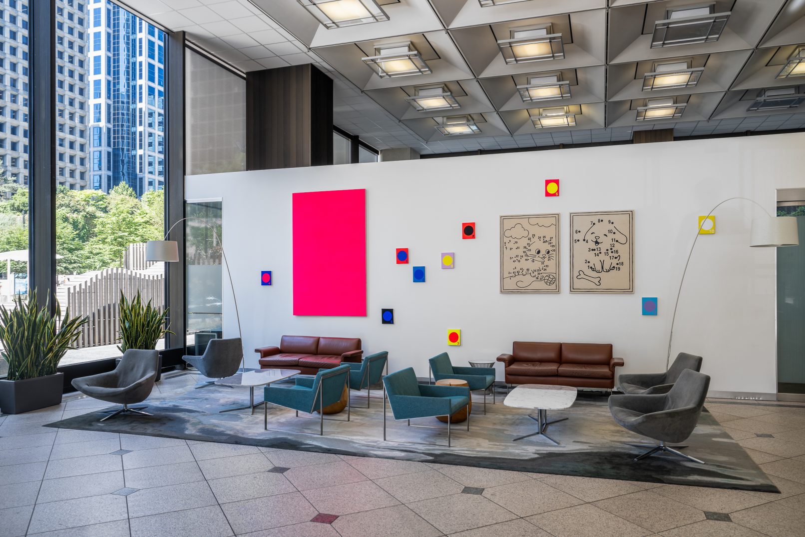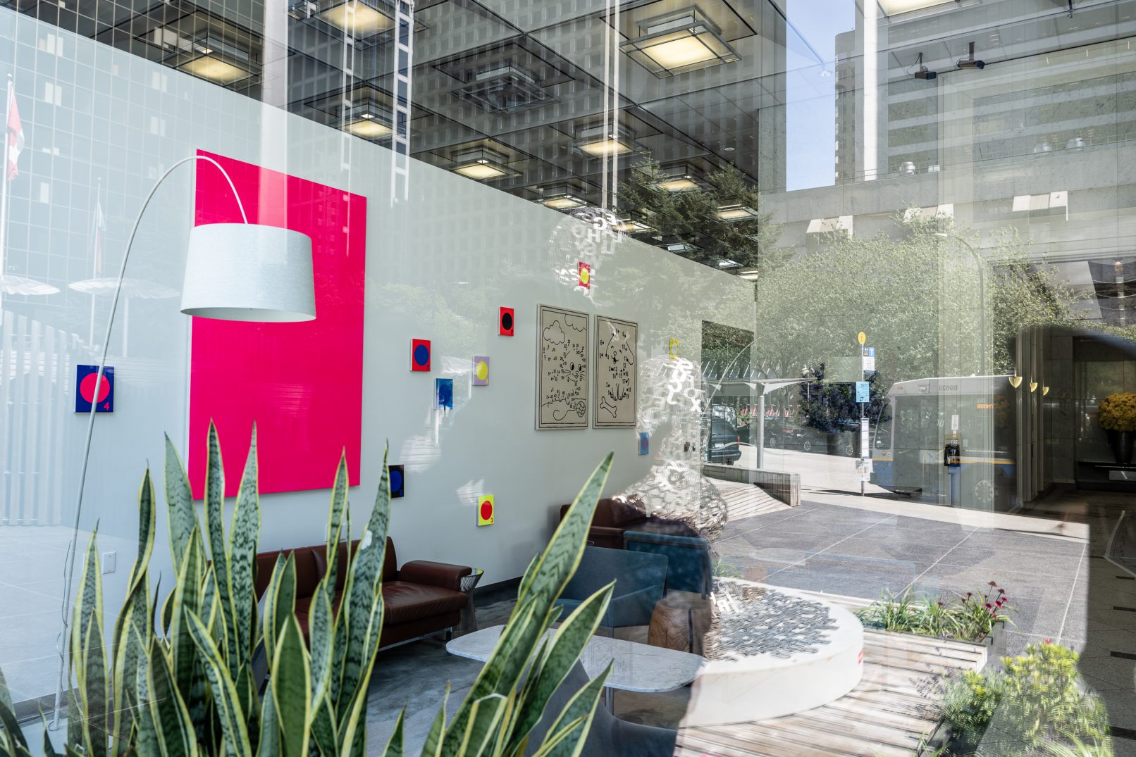 In Jeff Hallbauer’s exhibition, “One Day,” held at the newly inaugurated gallery space in the lobby of Three Bentall Center in downtown Vancouver, one is immediately struck by a 7 ft neon pink monochrome entitled “Psychic”; layered with acrylic wash, “Psychic” transcends its physical dimensions. Vibrating with a pulsating energy that spills beyond the edges of the canvas, it communicates directly with the viewer’s inner psyche through its colour affect.
