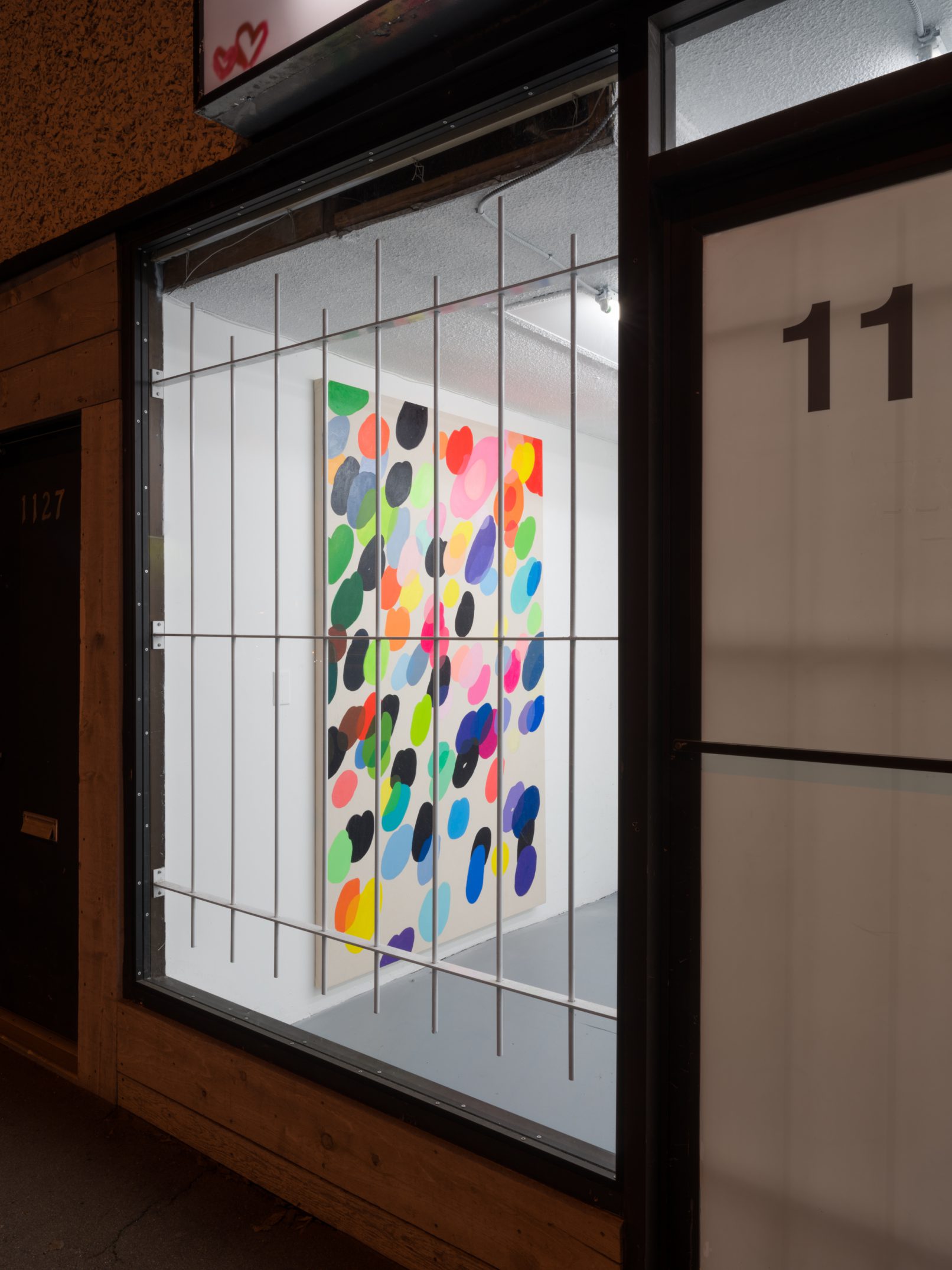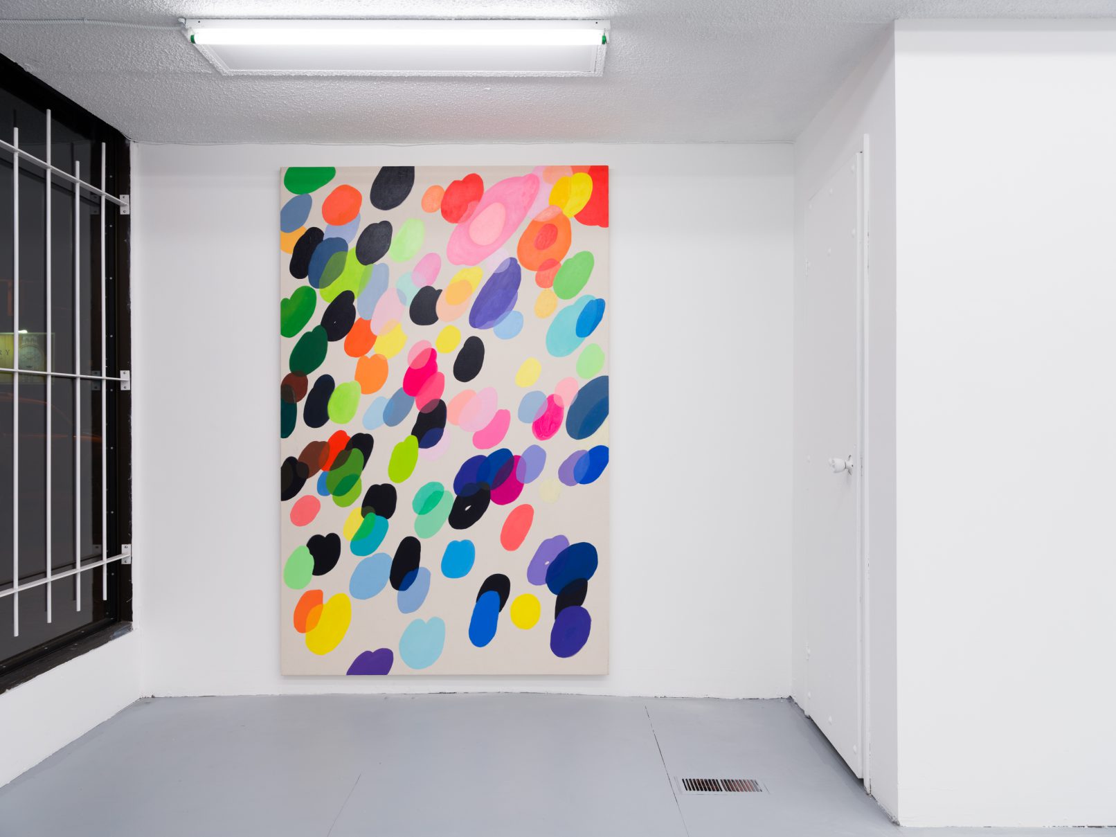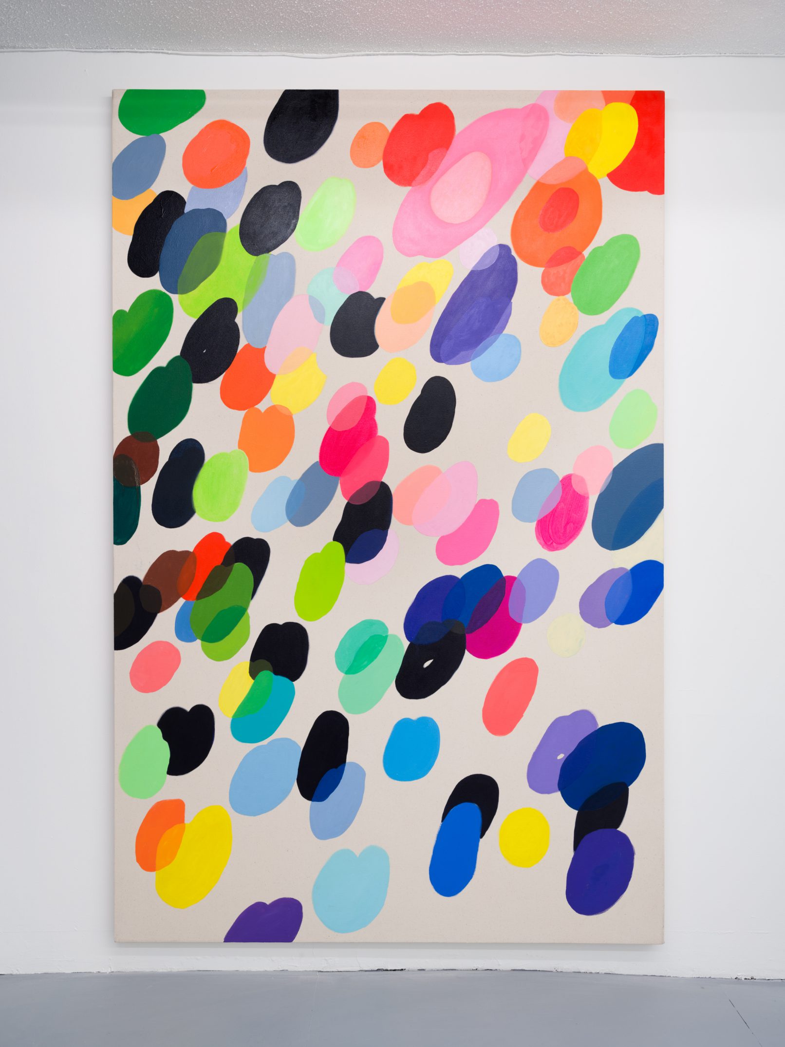 Jeff Hallbauer’s recent paintings are an extension of his larger practice, initiated by an intuitive and sensory-based approach. Hallbauer’s interest in industrial design and colour placement has informed his latest body of work. For example, in rug and carpet design, the artist observed how two opposing colours placed side-by-side inform each other and create an illusion of relationship. In his latest work, Happy Place, Hallbauer painted a swarm of bubbles ascending toward the upper right corner of the canvas. Where the bubbles intermittently overlap each other like a Venn diagram, Hallbauer explored colour relationships and illusion, sometimes creating a new colour in response to its parent colours, or by blending translucent layers together. There is a calculated ease about Hallbauer’s process, as well as a natural sense of humour. He drew my attention to a few hairs that had become trapped in the sticky oil paint, which had frustrated him; for me, however, this transfer of body-to-canvas suggested playful gesture in his embodied approach to painting. The artist’s work exudes a harmonious dichotomy between deliberate precision and natural instinct – between sharply carving out lines and allowing edges to bleed and splay. Hallbauer’s paintings are inherent of continual new beginnings and a sense of authentic self.