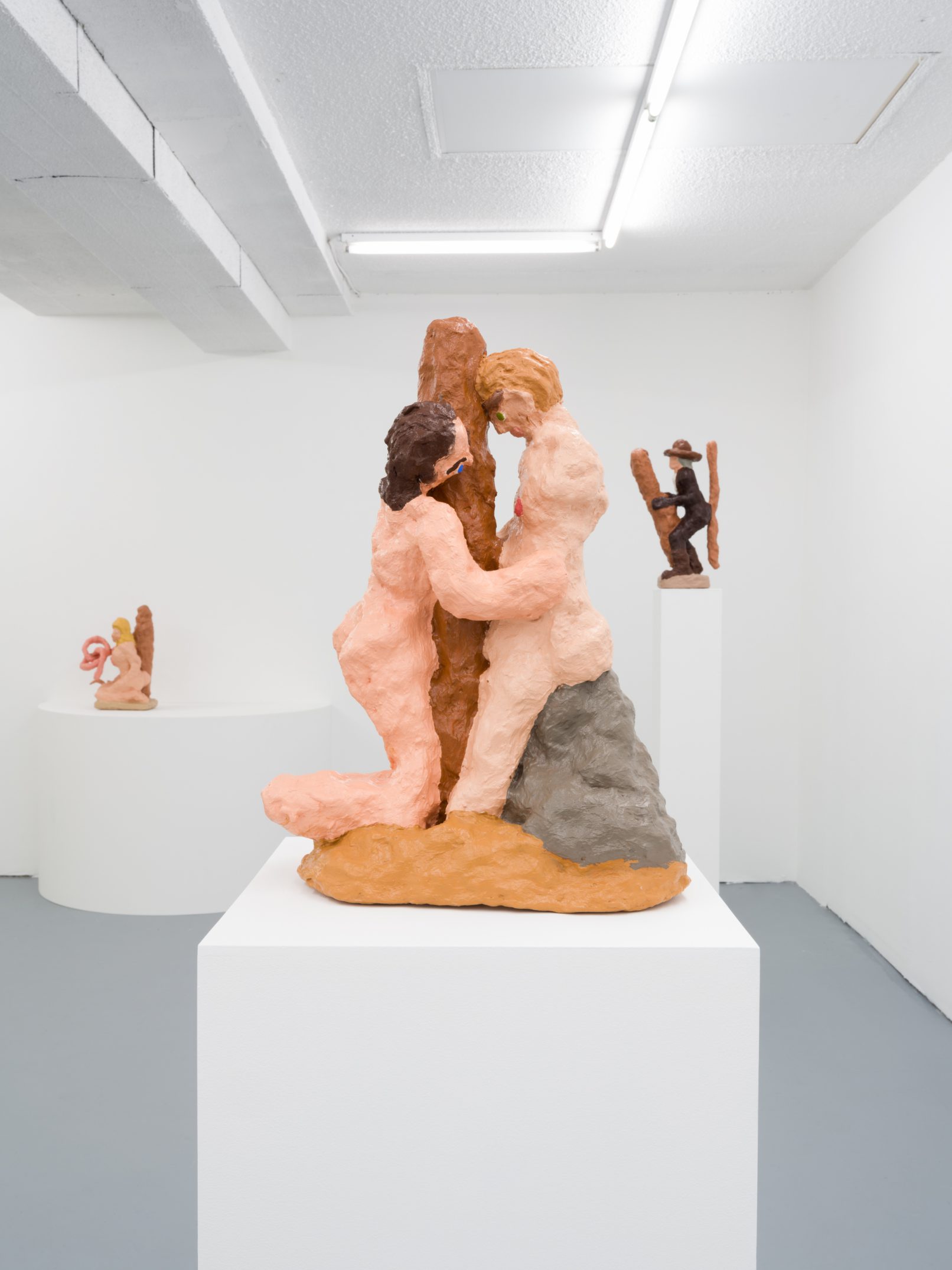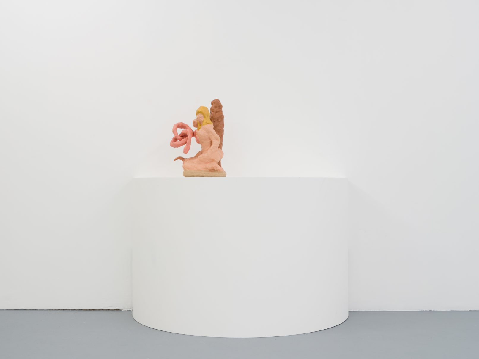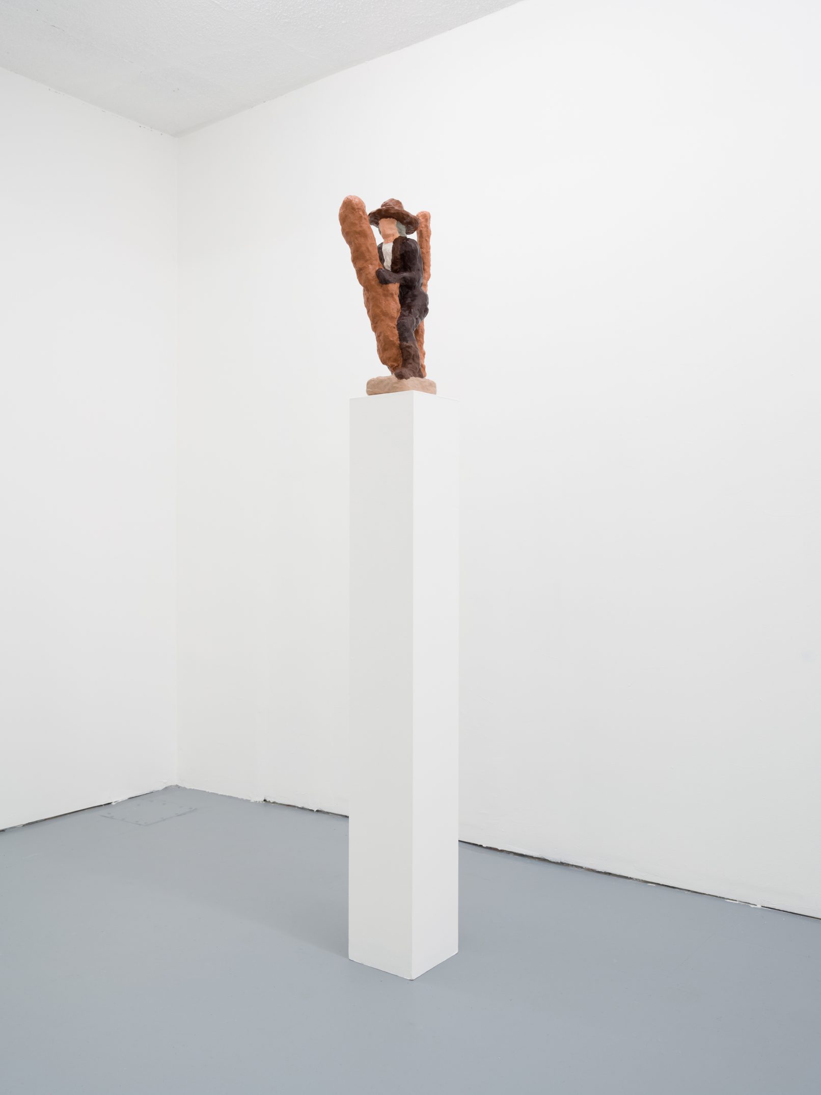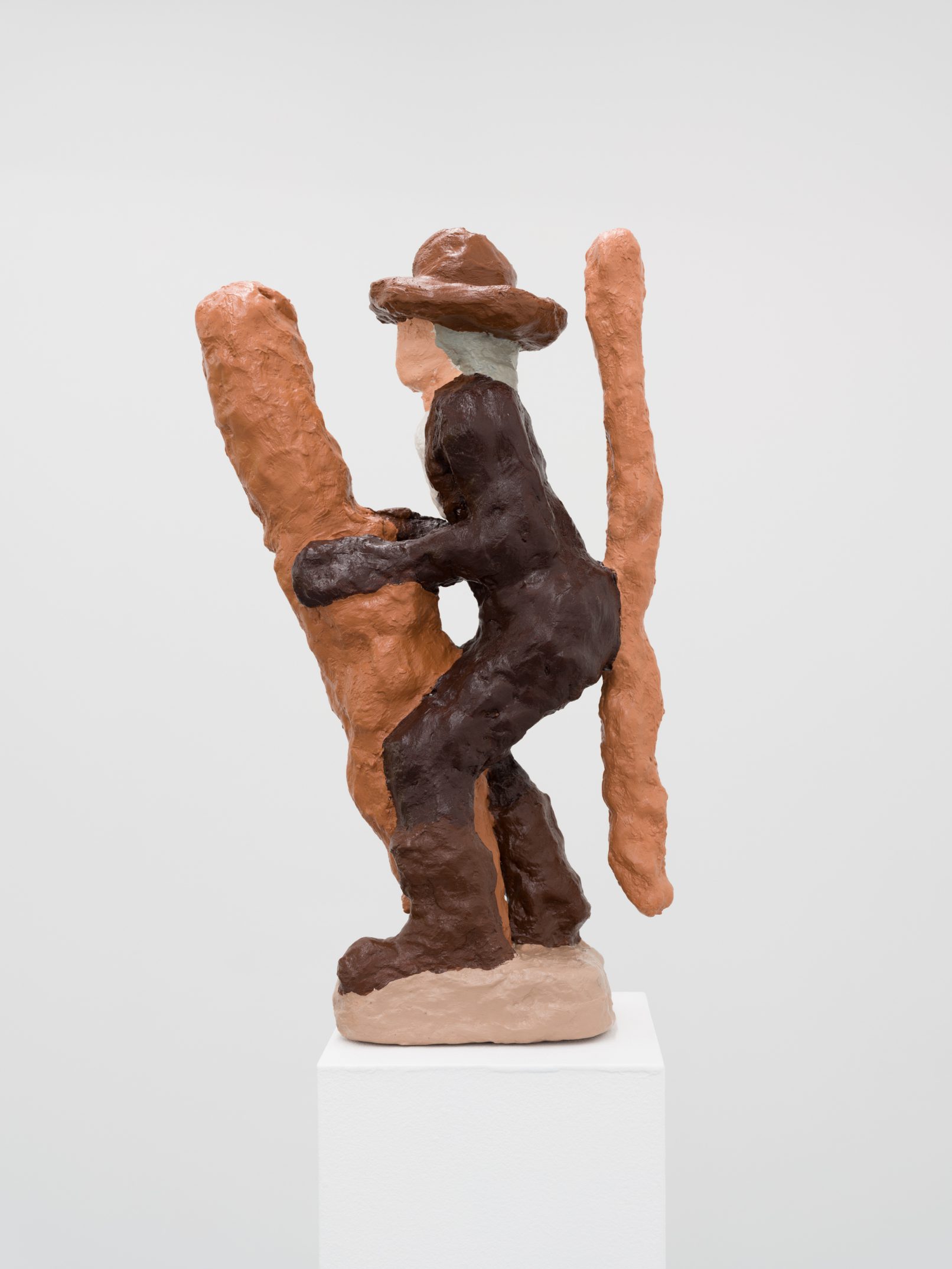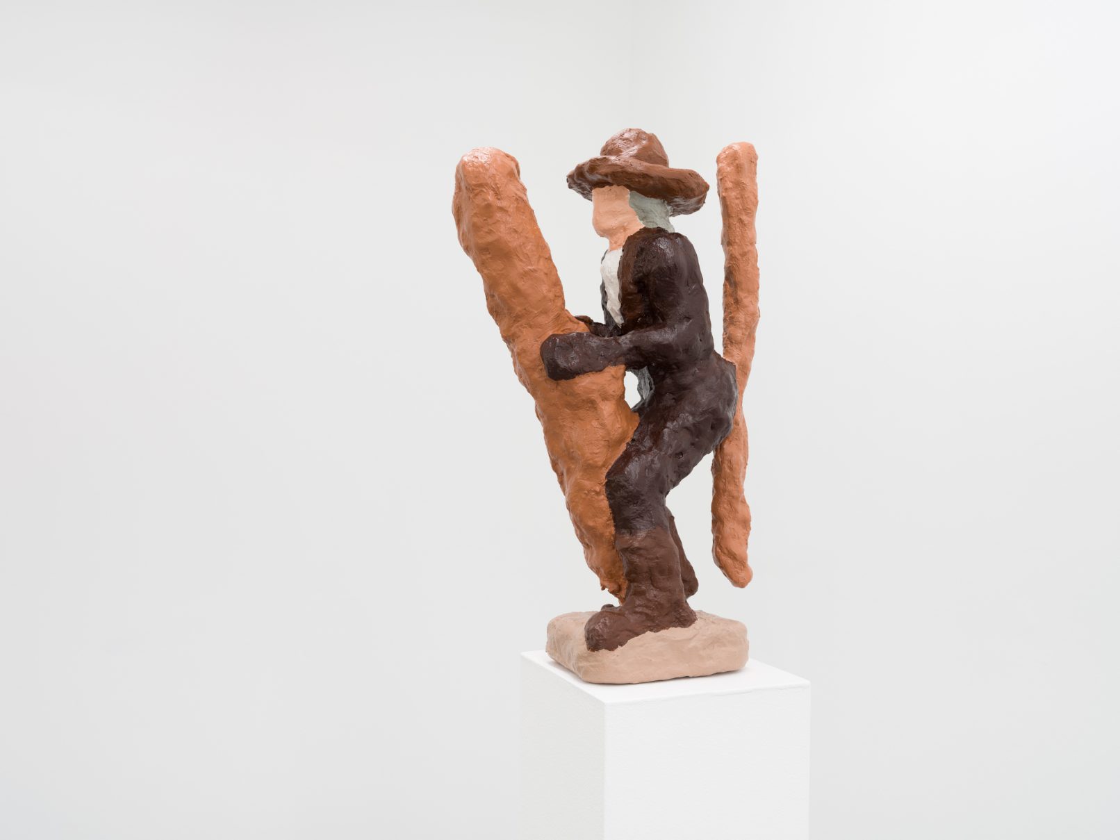 Barry Doupé’s artistic practice has primarily involved working with computer animation, developed through automatic drawing and writing exercises. In this new series of work, Doupé created seven plaster sculptures depicting various figures – both human and animal – posed with bread or breadstick. After observing athletic trophies and figurines at second-hand stores, Doupé wanted to dismantle the postures and positions that were decidedly monumentalized in celebratory gold or silver, like the moment before a slam dunk, or a dancer mid-leap. Instead of balls and rackets, Doupé found bread – an omnipresent object, material, and ancient form of sustenance. When making his sculptures, Doupé prefers to work quickly, molding the material just with enough contextual information for an audience to recognize figural forms like arms, legs, and hair. Colour helps this process along: paint becomes a methodology of revealing context and information on an otherwise nondescript surface. For example, in Figure with Staff, Doupé originally painted the figure in a monochrome coat of bubblegum pink paint; however, because he noticed that the figure’s features became lost in the cohesive wash of colour, he responded by applying a variety of shades, leaving only the nipples the original pink hue. It is with this intuitive way of making that humour arises out of his work, as the objects and their bread companions become immortalized in plaster and paint.