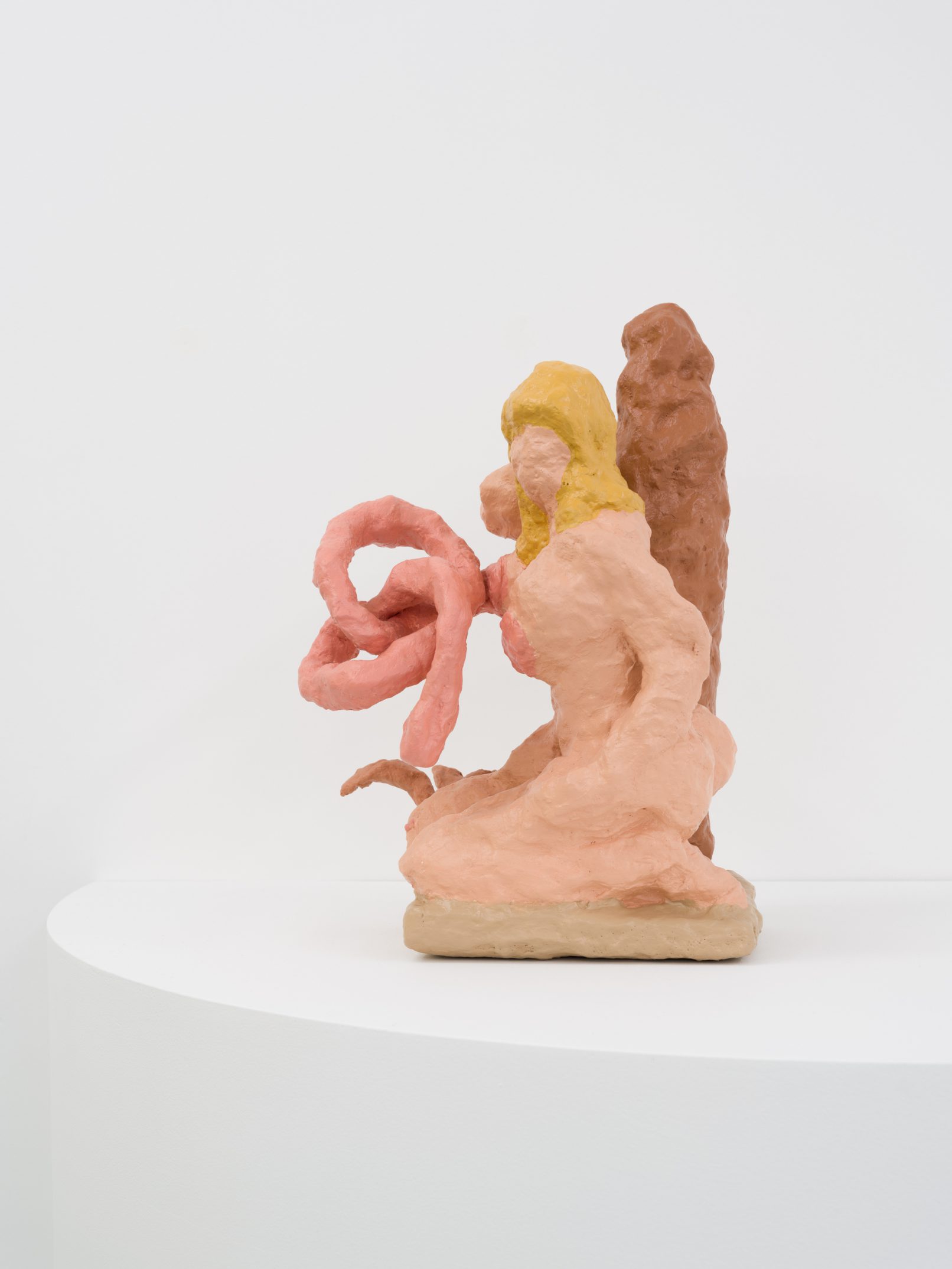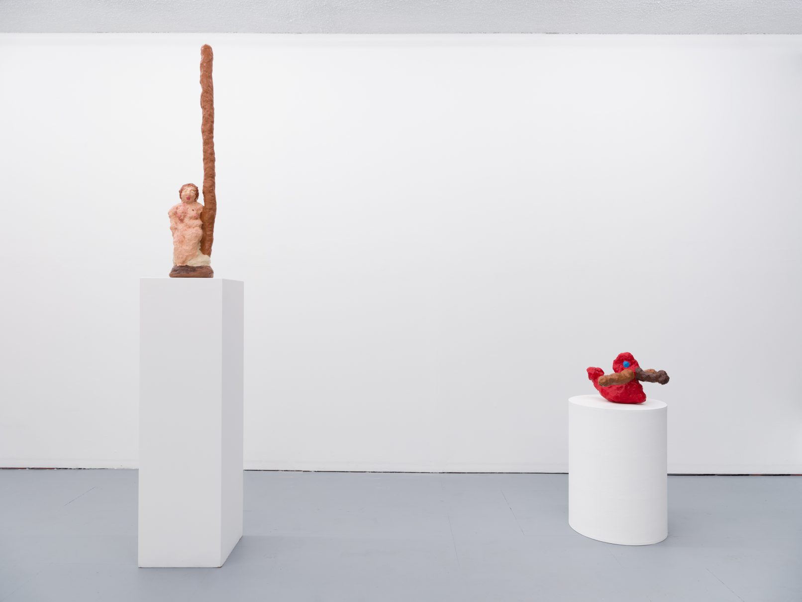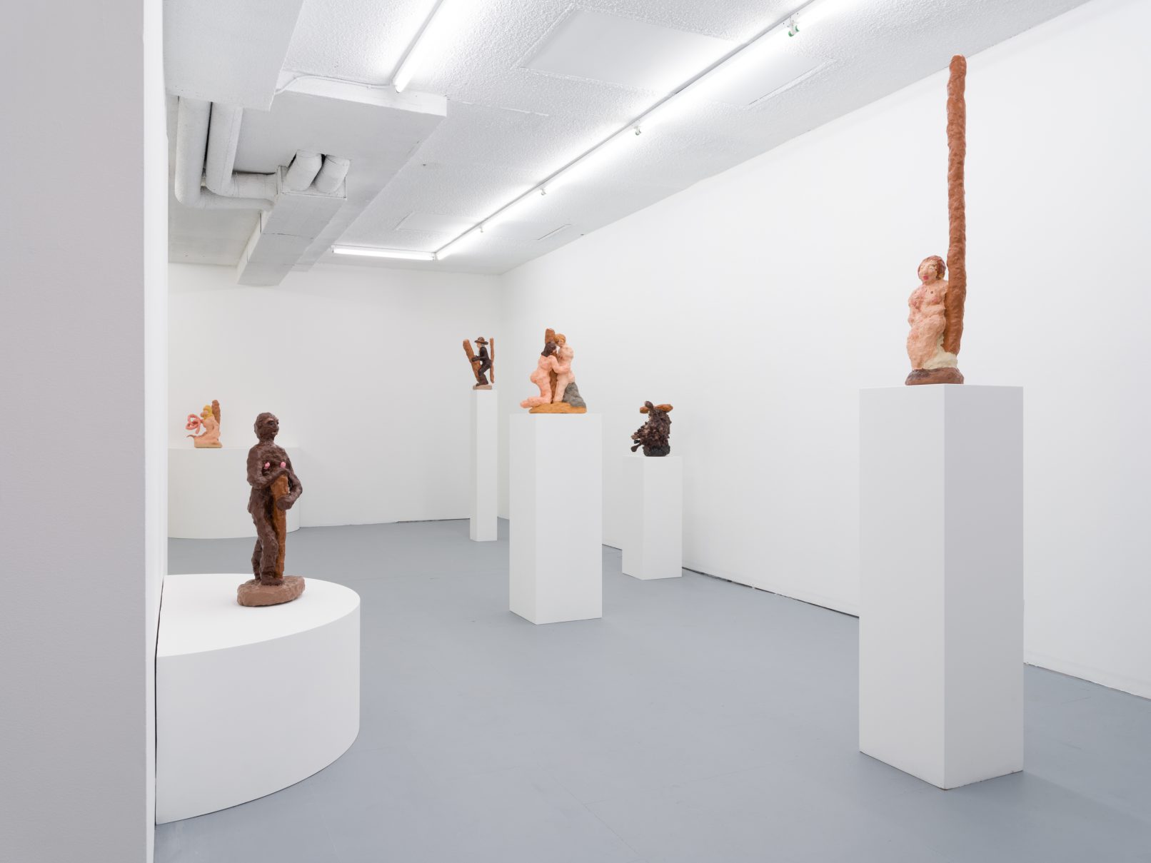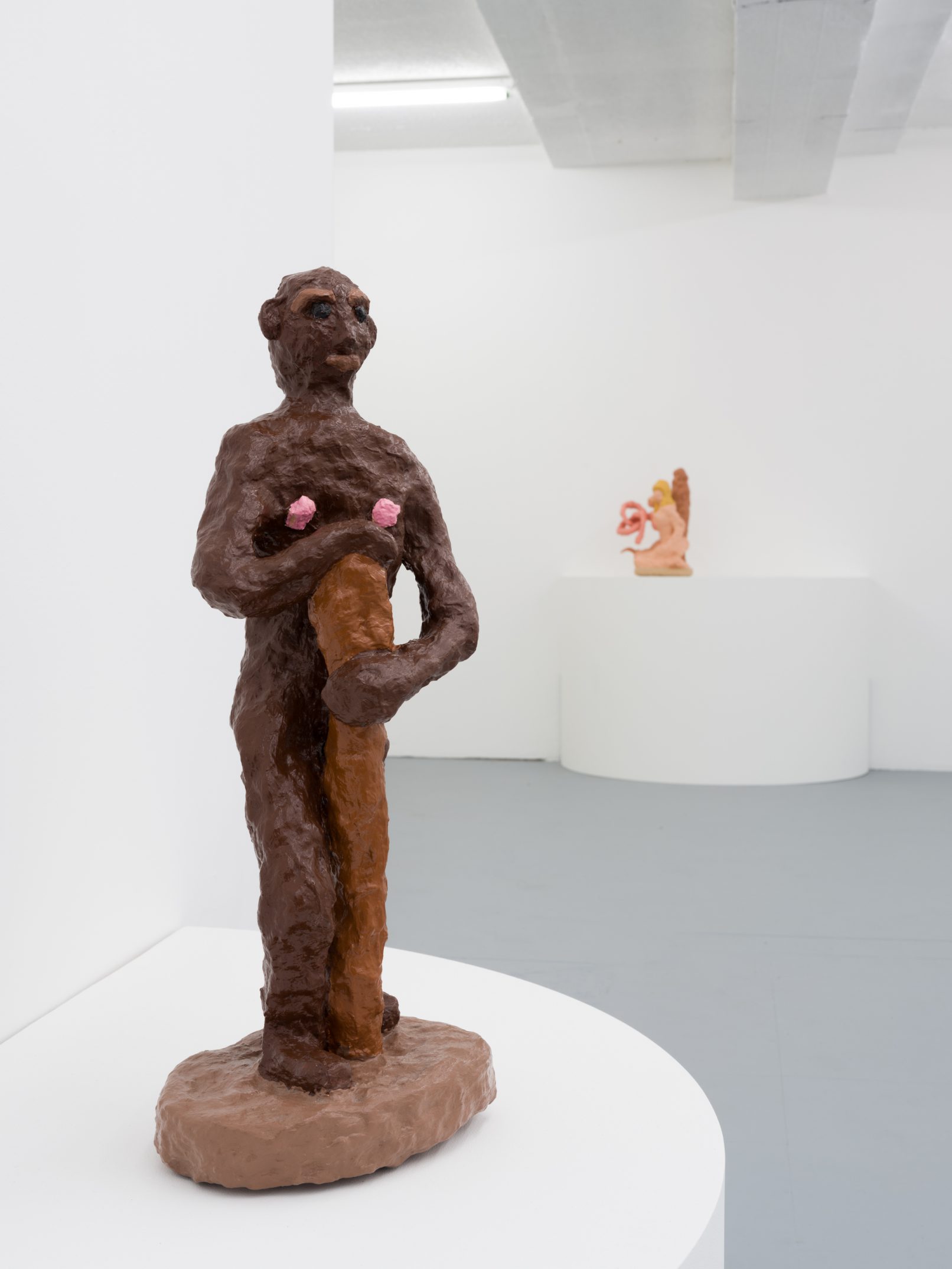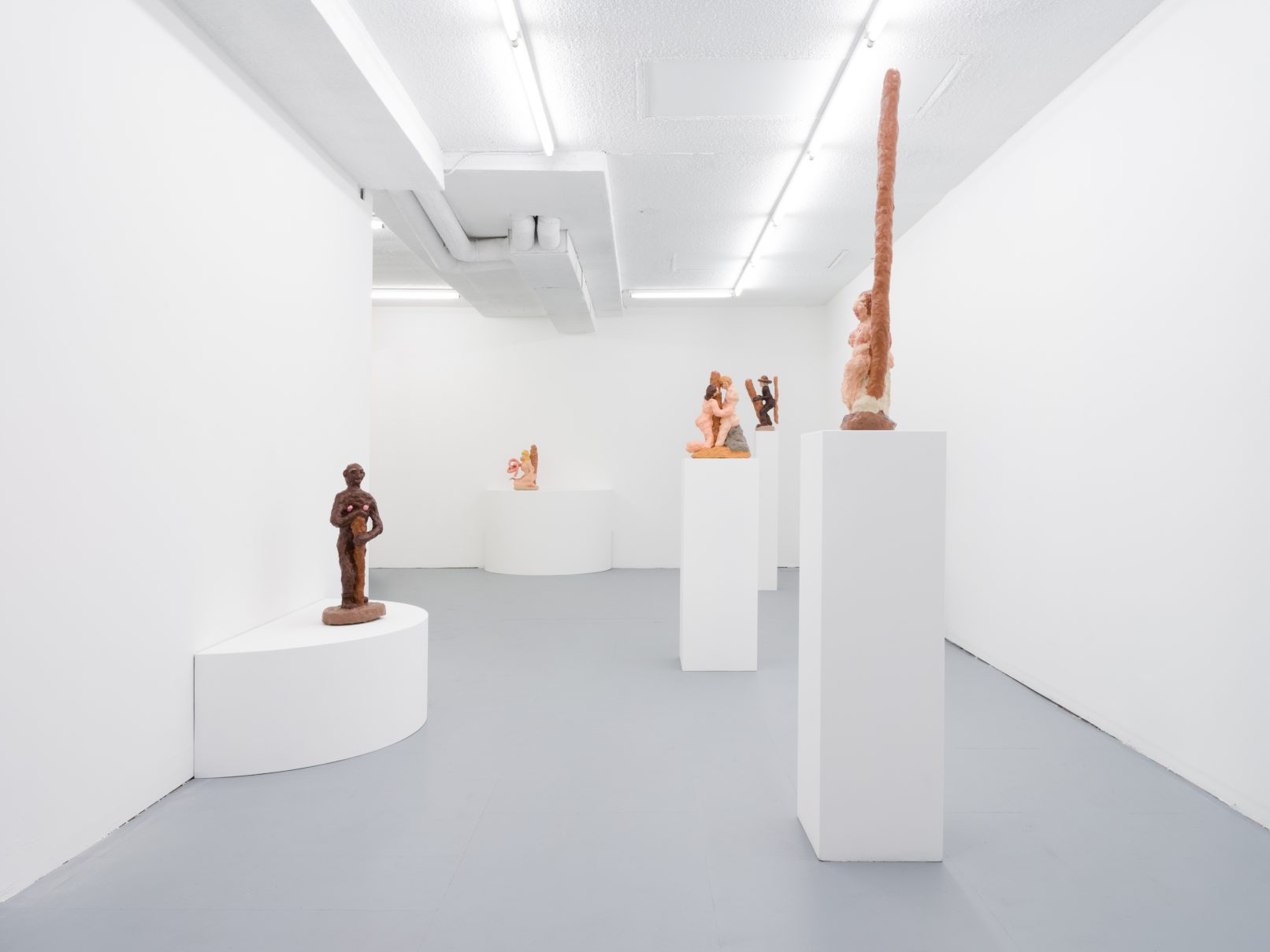 Barry Doupé’s artistic practice has primarily involved working with computer animation, developed through automatic drawing and writing exercises. In this new series of work, Doupé created seven plaster sculptures depicting various figures – both human and animal – posed with bread or breadstick. After observing athletic trophies and figurines at second-hand stores, Doupé wanted to dismantle the postures and positions that were decidedly monumentalized in celebratory gold or silver, like the moment before a slam dunk, or a dancer mid-leap. Instead of balls and rackets, Doupé found bread – an omnipresent object, material, and ancient form of sustenance. When making his sculptures, Doupé prefers to work quickly, molding the material just with enough contextual information for an audience to recognize figural forms like arms, legs, and hair. Colour helps this process along: paint becomes a methodology of revealing context and information on an otherwise nondescript surface. For example, in Figure with Staff, Doupé originally painted the figure in a monochrome coat of bubblegum pink paint; however, because he noticed that the figure’s features became lost in the cohesive wash of colour, he responded by applying a variety of shades, leaving only the nipples the original pink hue. It is with this intuitive way of making that humour arises out of his work, as the objects and their bread companions become immortalized in plaster and paint.