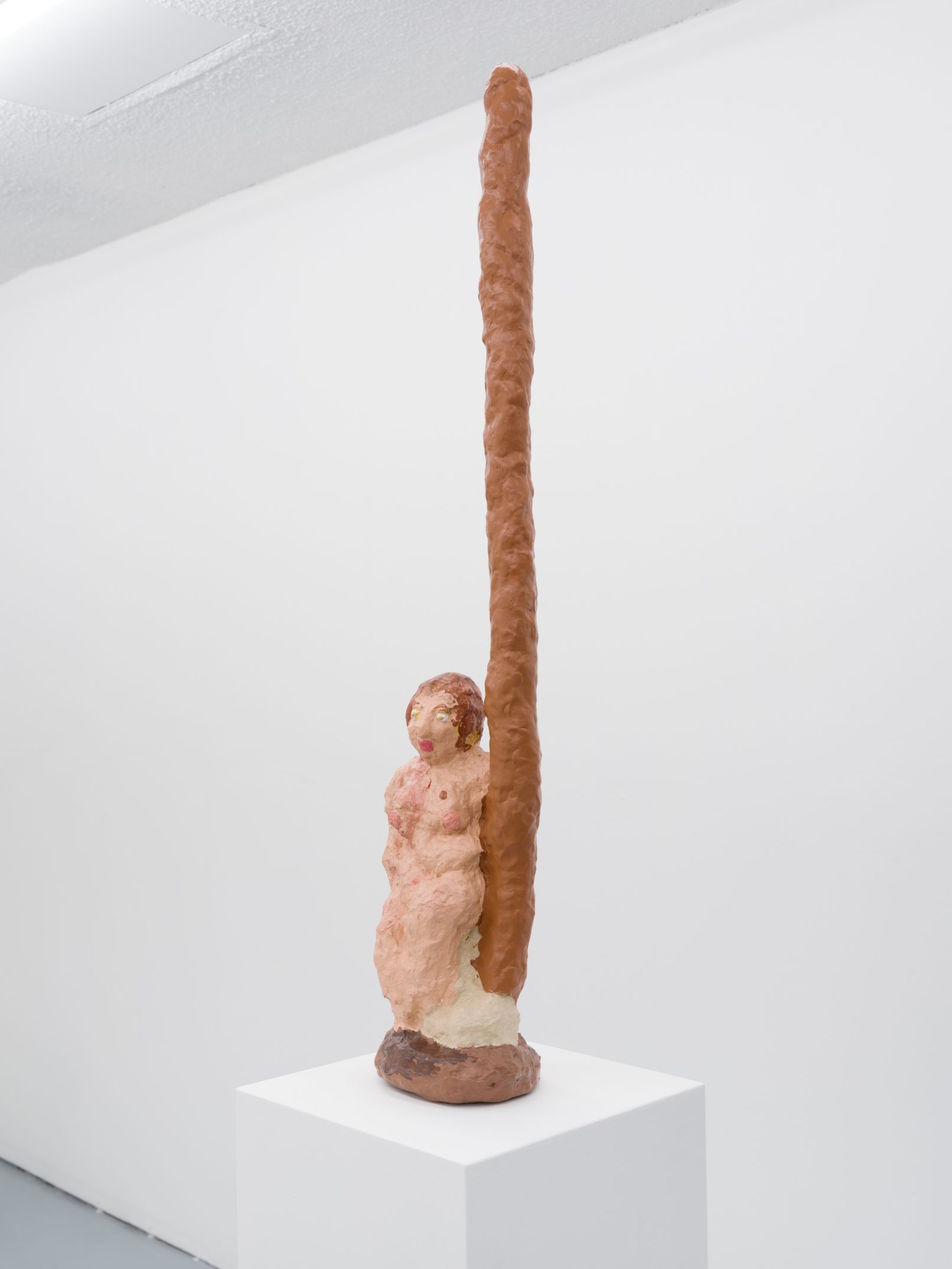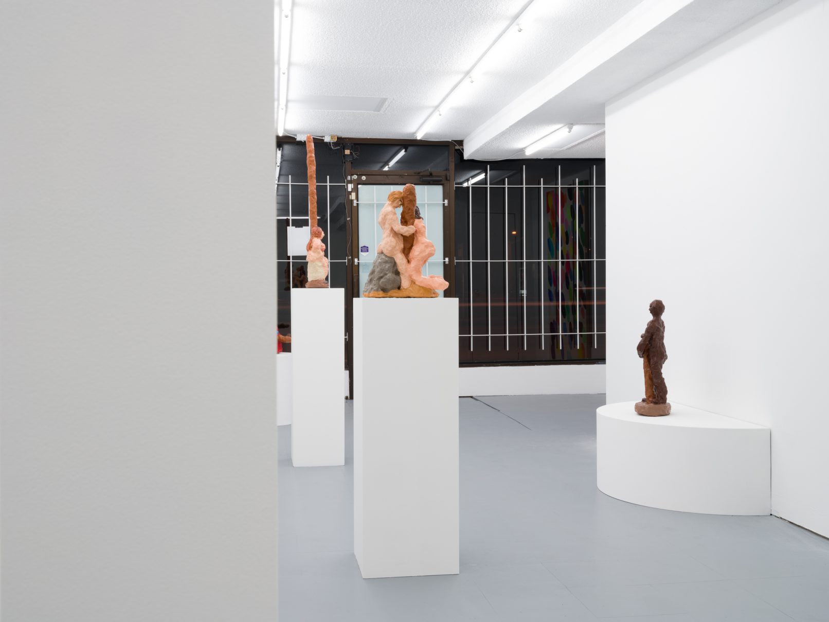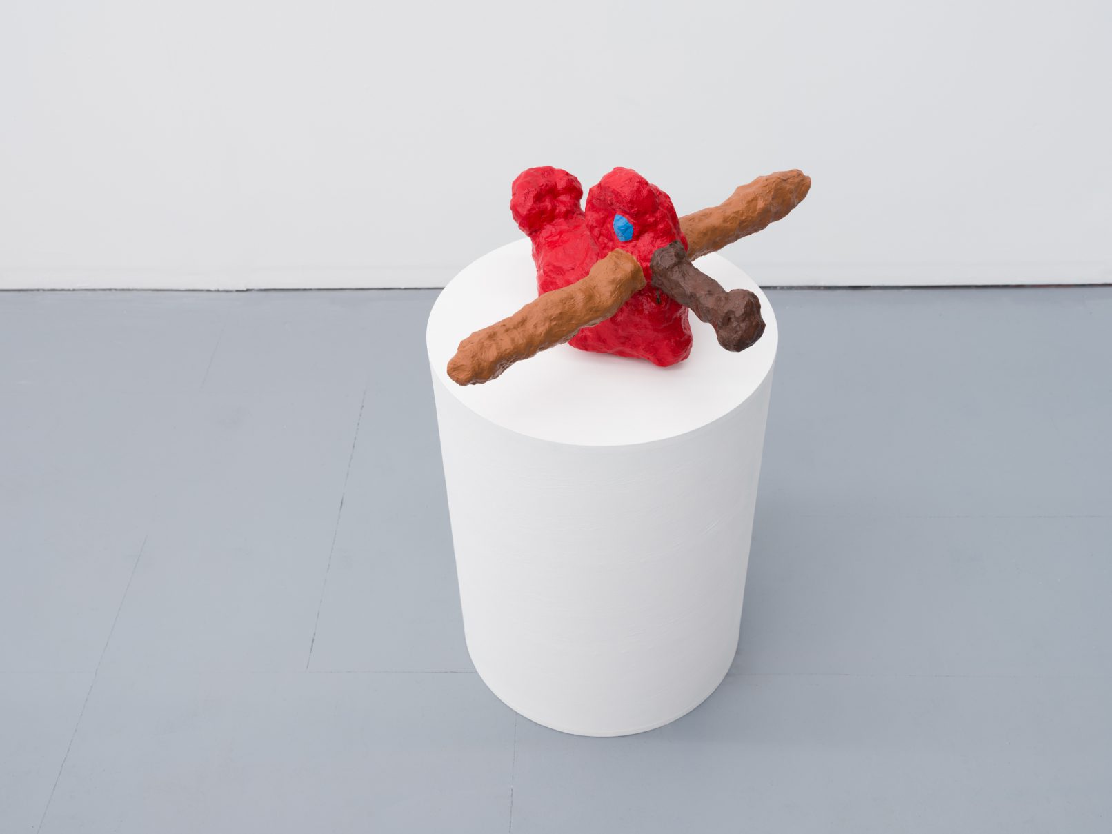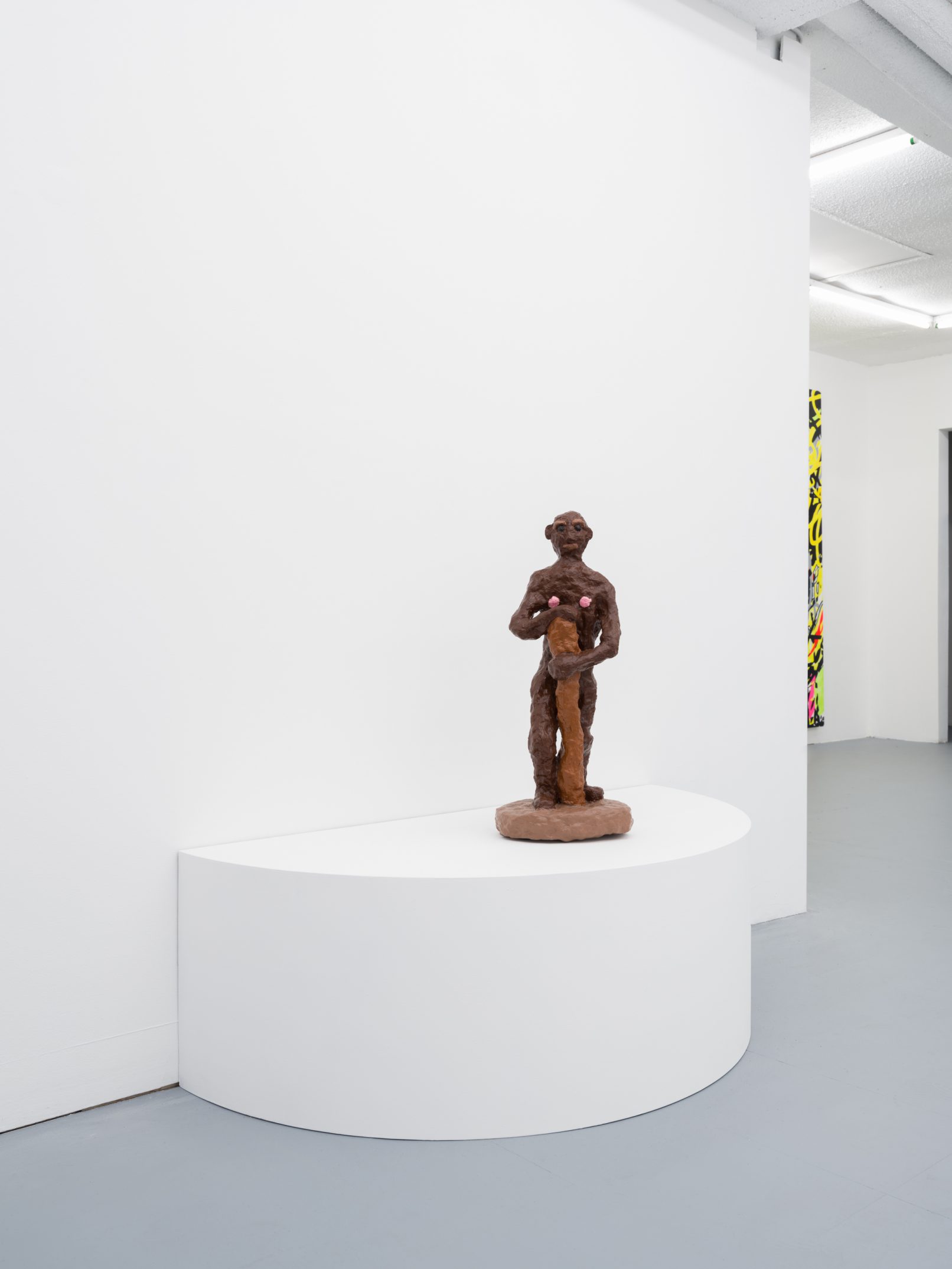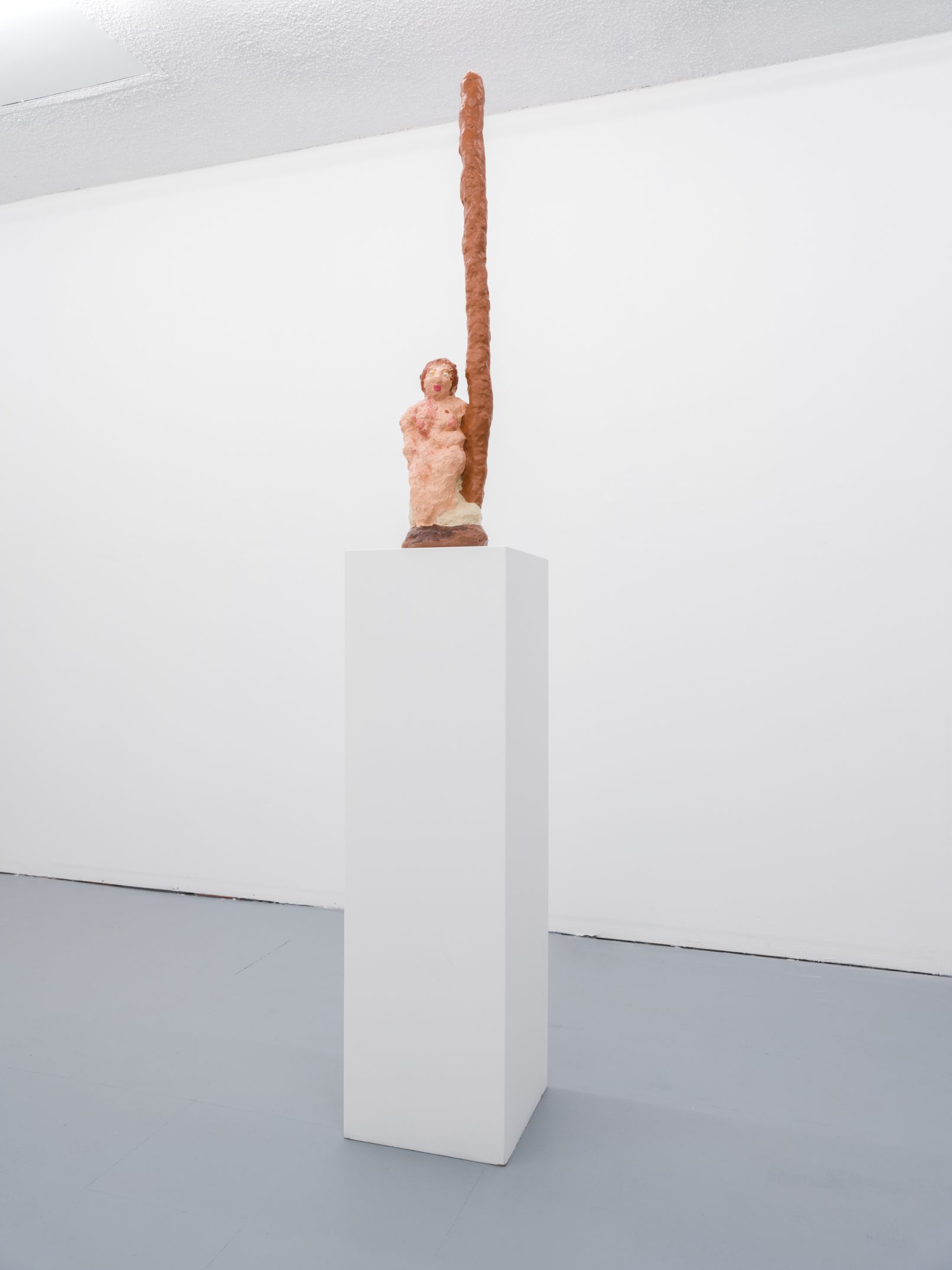 Barry Doupé’s artistic practice has primarily involved working with computer animation, developed through automatic drawing and writing exercises. In this new series of work, Doupé created seven plaster sculptures depicting various figures – both human and animal – posed with bread or breadstick. After observing athletic trophies and figurines at second-hand stores, Doupé wanted to dismantle the postures and positions that were decidedly monumentalized in celebratory gold or silver, like the moment before a slam dunk, or a dancer mid-leap. Instead of balls and rackets, Doupé found bread – an omnipresent object, material, and ancient form of sustenance. When making his sculptures, Doupé prefers to work quickly, molding the material just with enough contextual information for an audience to recognize figural forms like arms, legs, and hair. Colour helps this process along: paint becomes a methodology of revealing context and information on an otherwise nondescript surface. For example, in Figure with Staff, Doupé originally painted the figure in a monochrome coat of bubblegum pink paint; however, because he noticed that the figure’s features became lost in the cohesive wash of colour, he responded by applying a variety of shades, leaving only the nipples the original pink hue. It is with this intuitive way of making that humour arises out of his work, as the objects and their bread companions become immortalized in plaster and paint.