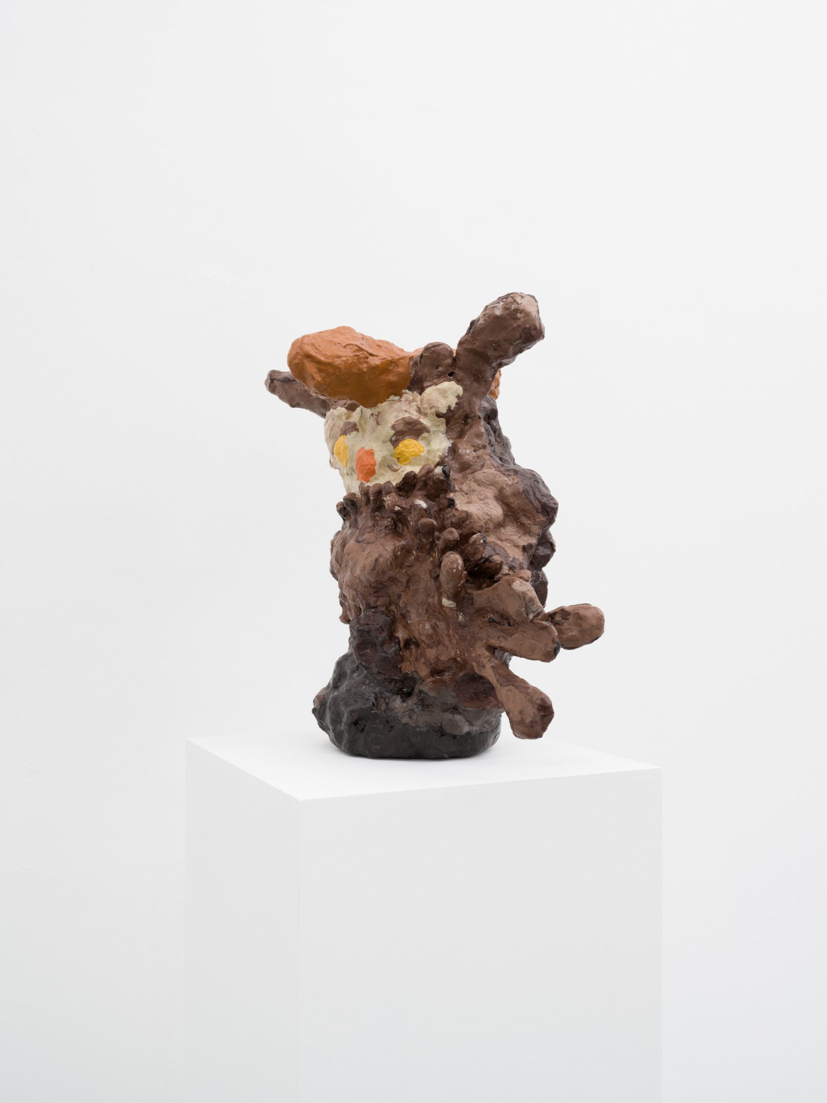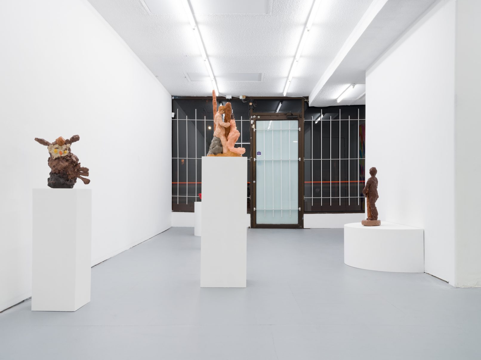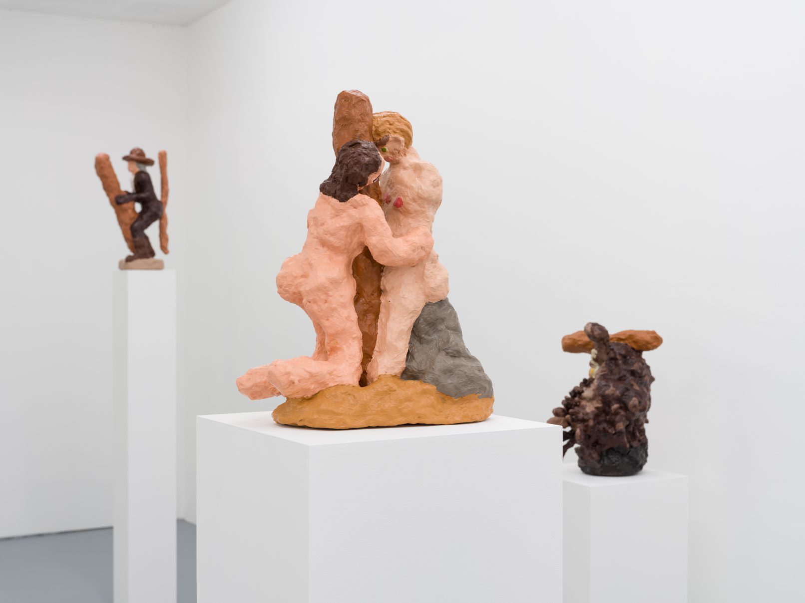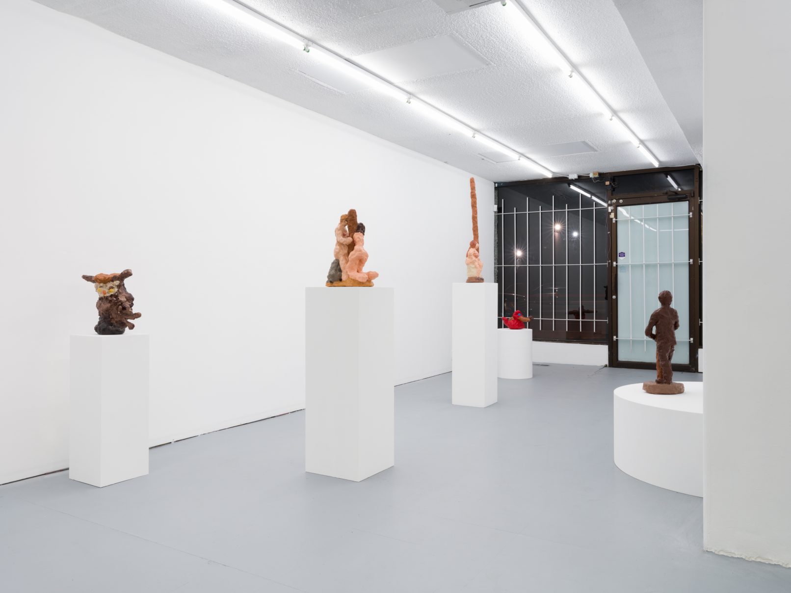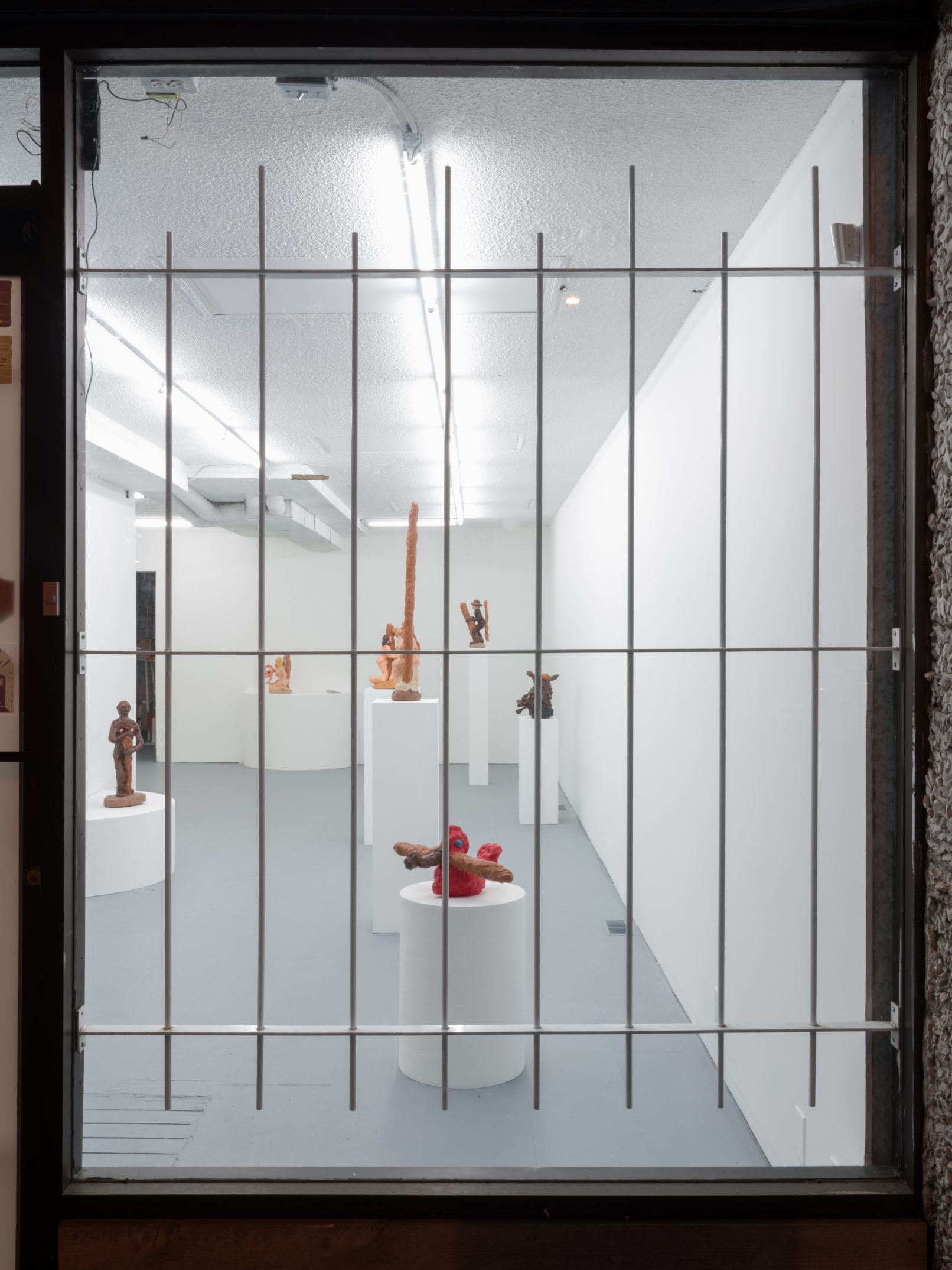 Barry Doupé’s artistic practice has primarily involved working with computer animation, developed through automatic drawing and writing exercises. In this new series of work, Doupé created seven plaster sculptures depicting various figures – both human and animal – posed with bread or breadstick. After observing athletic trophies and figurines at second-hand stores, Doupé wanted to dismantle the postures and positions that were decidedly monumentalized in celebratory gold or silver, like the moment before a slam dunk, or a dancer mid-leap. Instead of balls and rackets, Doupé found bread – an omnipresent object, material, and ancient form of sustenance. When making his sculptures, Doupé prefers to work quickly, molding the material just with enough contextual information for an audience to recognize figural forms like arms, legs, and hair. Colour helps this process along: paint becomes a methodology of revealing context and information on an otherwise nondescript surface. For example, in Figure with Staff, Doupé originally painted the figure in a monochrome coat of bubblegum pink paint; however, because he noticed that the figure’s features became lost in the cohesive wash of colour, he responded by applying a variety of shades, leaving only the nipples the original pink hue. It is with this intuitive way of making that humour arises out of his work, as the objects and their bread companions become immortalized in plaster and paint.