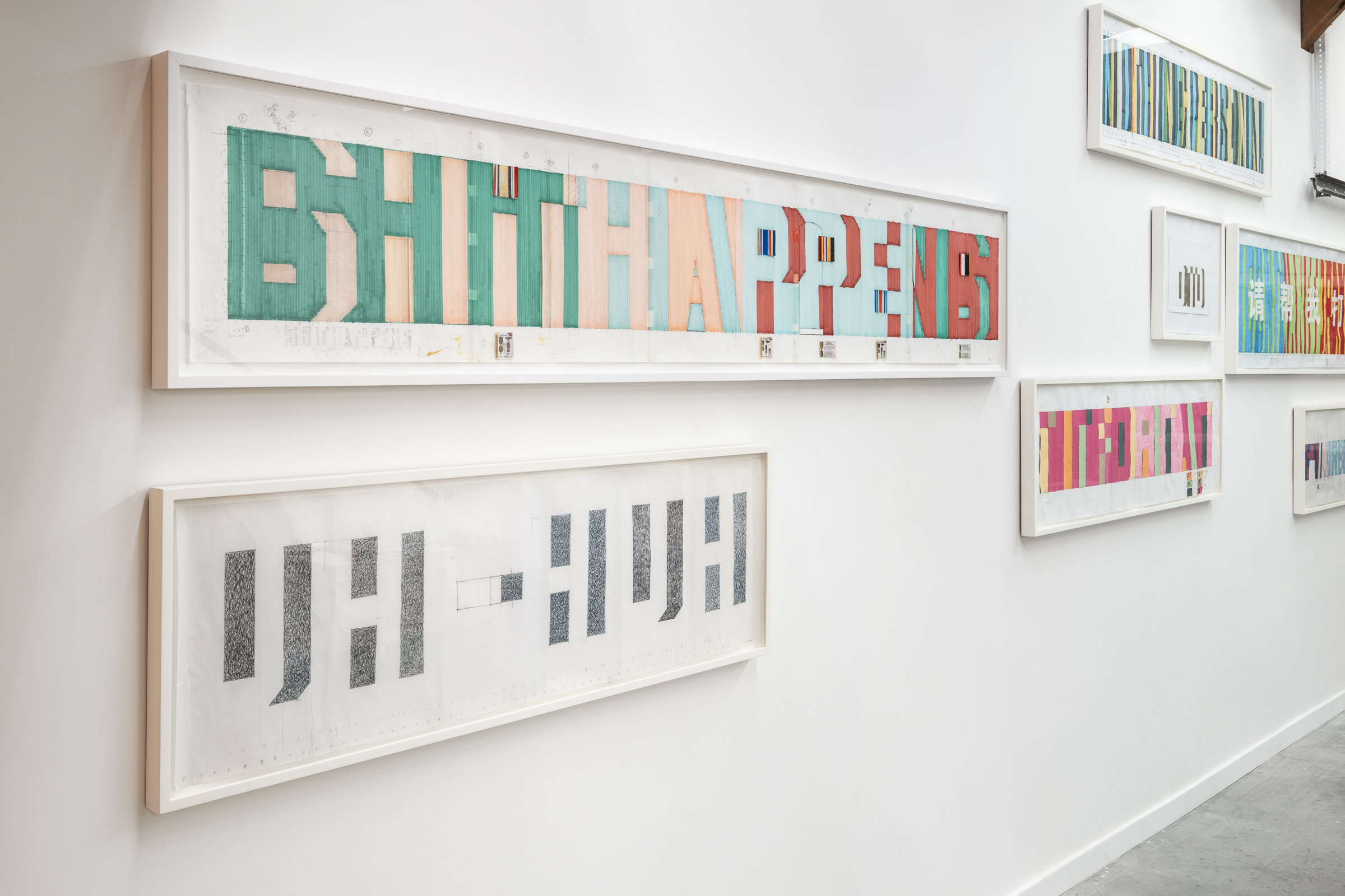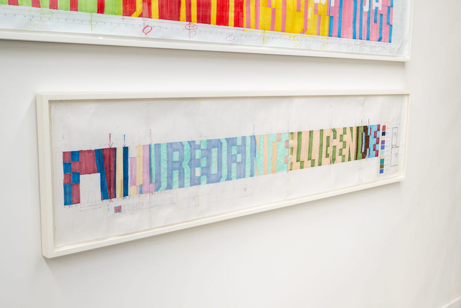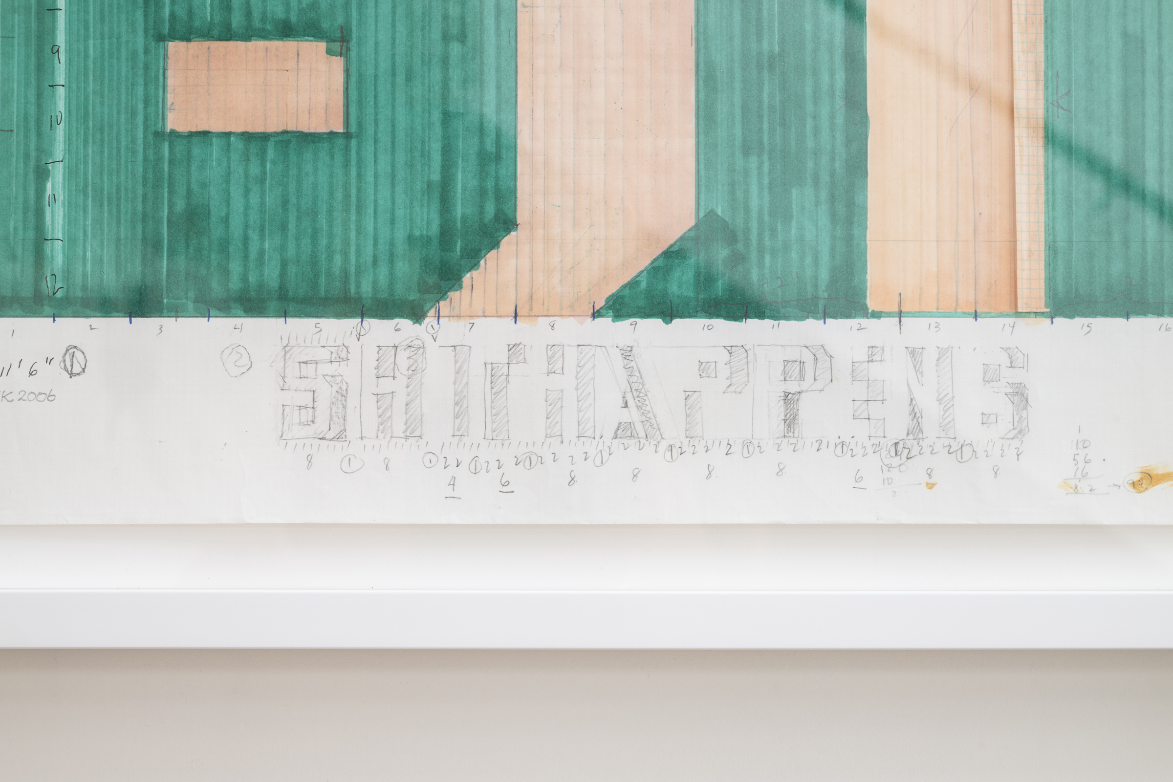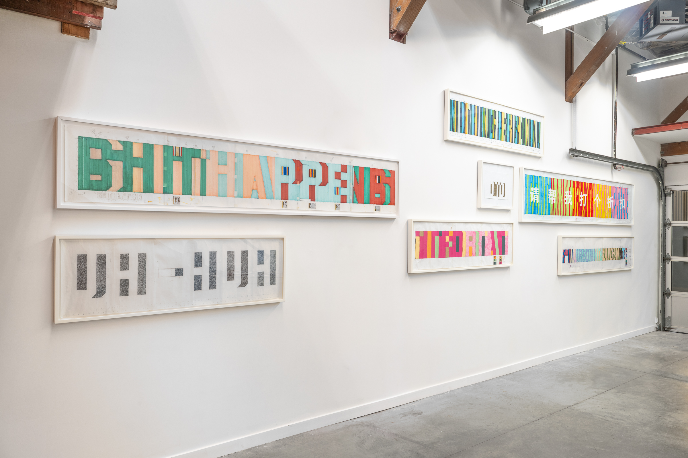 This exhibition titled UH-HUH/SORRY, work of Cathy Busby and Garry Neill Kennedy, includes a selection of prints from Busby’s SORRY series (2005-2014) and Kennedy’s SEIZED suite of prints (1991); as well as a host of WORKING DRAWINGS mapping Kennedy’s large wall-text paintings of the 1990s to 2000s, including UH-HUH (S.L. Simpson Gallery, Toronto, 1992), and I DON’T WANT TO PAY THE FULL PRICE (Centre A, Vancouver, 2008). Busby’s ATRIUM prints (2010) question art gallery display practices and were developed during her artist-residency project at the Art Gallery of Nova Scotia. This dynamic installation at Wil Aballe includes WE ARE SORRY fragments, and brings together the works alongside a selection of printed matter, highlighting the conceptual processes of this artist couple.