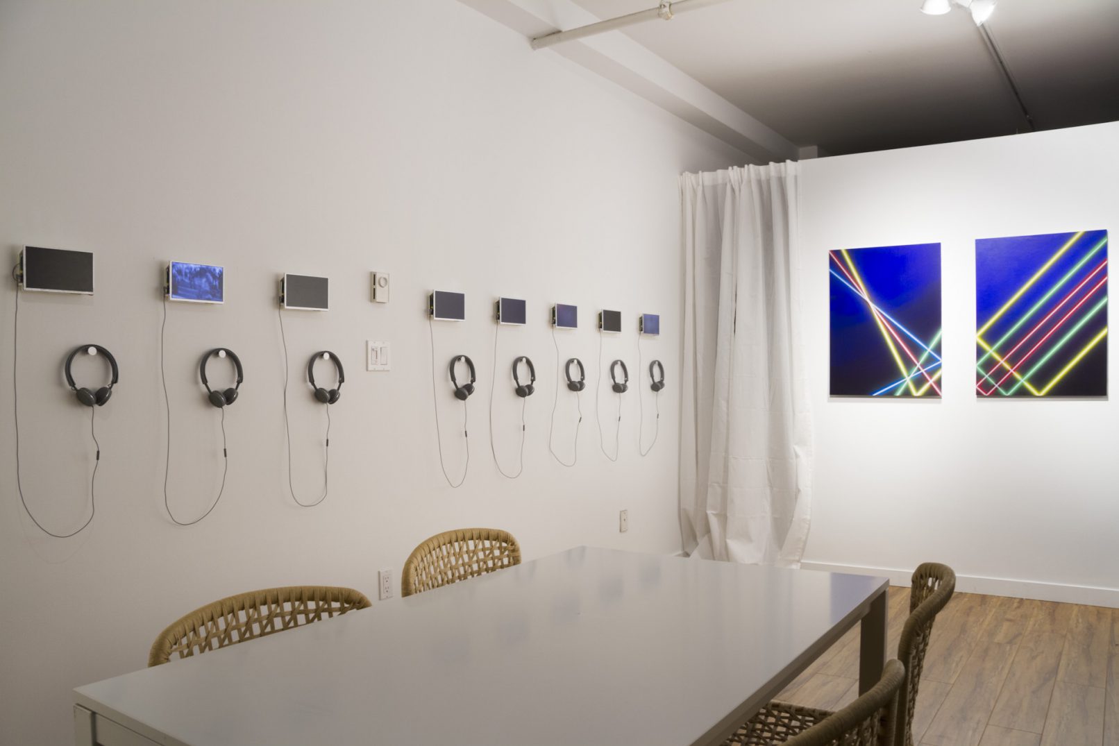 Mark Dudiak’s Laser Paintings are an ongoing series of air-brushed paintings evocative of 1990’s electronic music album covers or discotheque murals. Each Laser Painting is created systematically using a semi-mechanical airbrushing technique of the artist’s own design, according to a set of predetermined formal parameters; uniform dimensions, a fixed palette based upon the chroma in the visible light spectrum, and a strict figure / ground relationship. They evoke modernist colour field paintings such as Barnett Newman’s zip paintings.