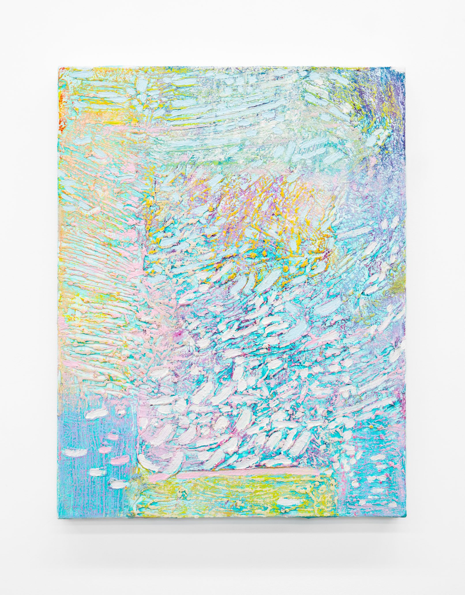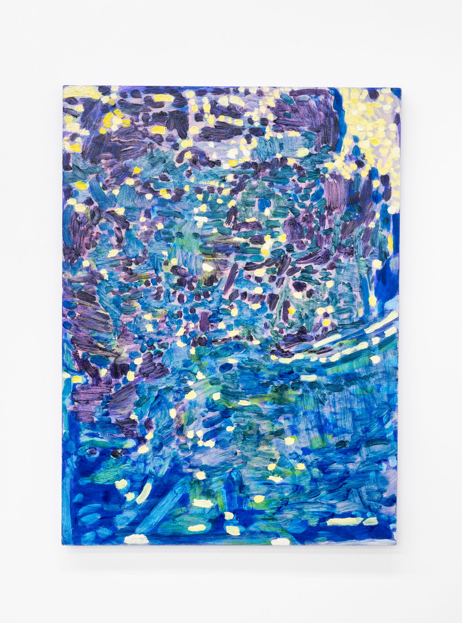 Taking the window as a point of departure—at once a structure for seeing and an old trope in painting—the works in Wind-Eye invoke painting as a technology of location. They document summertime meanderings, queer moments reflected in a pane of glass, rain on the skin and rivulets of cloud and light, cascading out from waves.