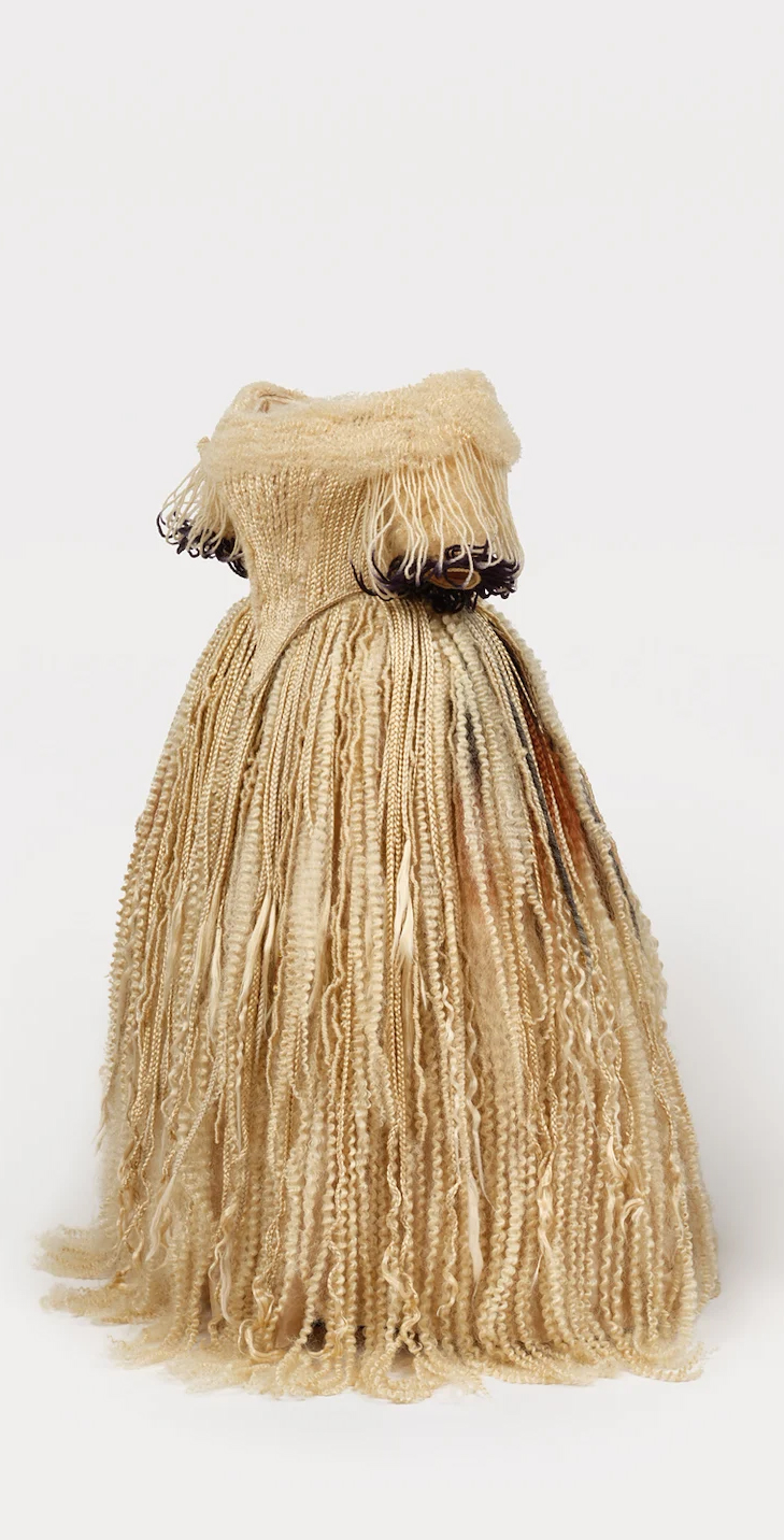 Central to the presentation are works from The Golden Section series, composed of commercially sourced blonde hair extensions knotted onto vinyl mesh. Referencing ideals of proportion, the repetitive act of knotting becomes both labour and language, transforming hair into a modular, architectural surface that implicates systems of standardization and value. In, Untitled Neckpiece, Jones collapses adornment and constraint into a wearable form. Combining human hair with bronze and magnetized elements, the work evokes historical associations of ornament and bodily regulation, positioning jewellery as both intimate object and weighted cultural signifier.