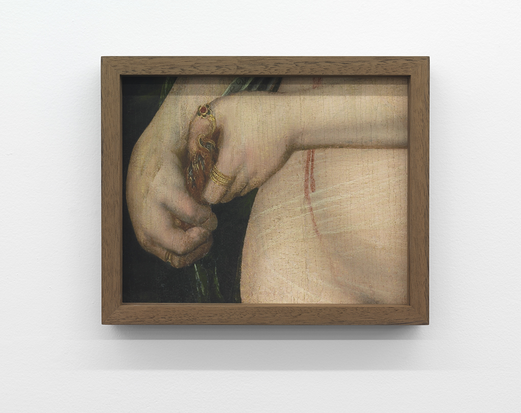 Lucretia’s Toe is an inquiry spurred by the experience of a Cranach painting of Lucretia seen by chance on a museum wall. Hill-Carroll works to recuperate the Roman heroine whose rape and subsequent virtuous self stabbing was exploited for erotic subject by many in the Renaissance but particularly by Lucas Cranach the Elder. He painted her boneless sex doll-style upwards of fifty five times. Time spent in Cranach’s digital archive produces photographs of painting stills and leads to still lives made in the studio. Odd foot made still life. A rock stands in. The pyschosexual gesture held. An audio monologue and a silent video montage move Lucretia’s Toe toward release.