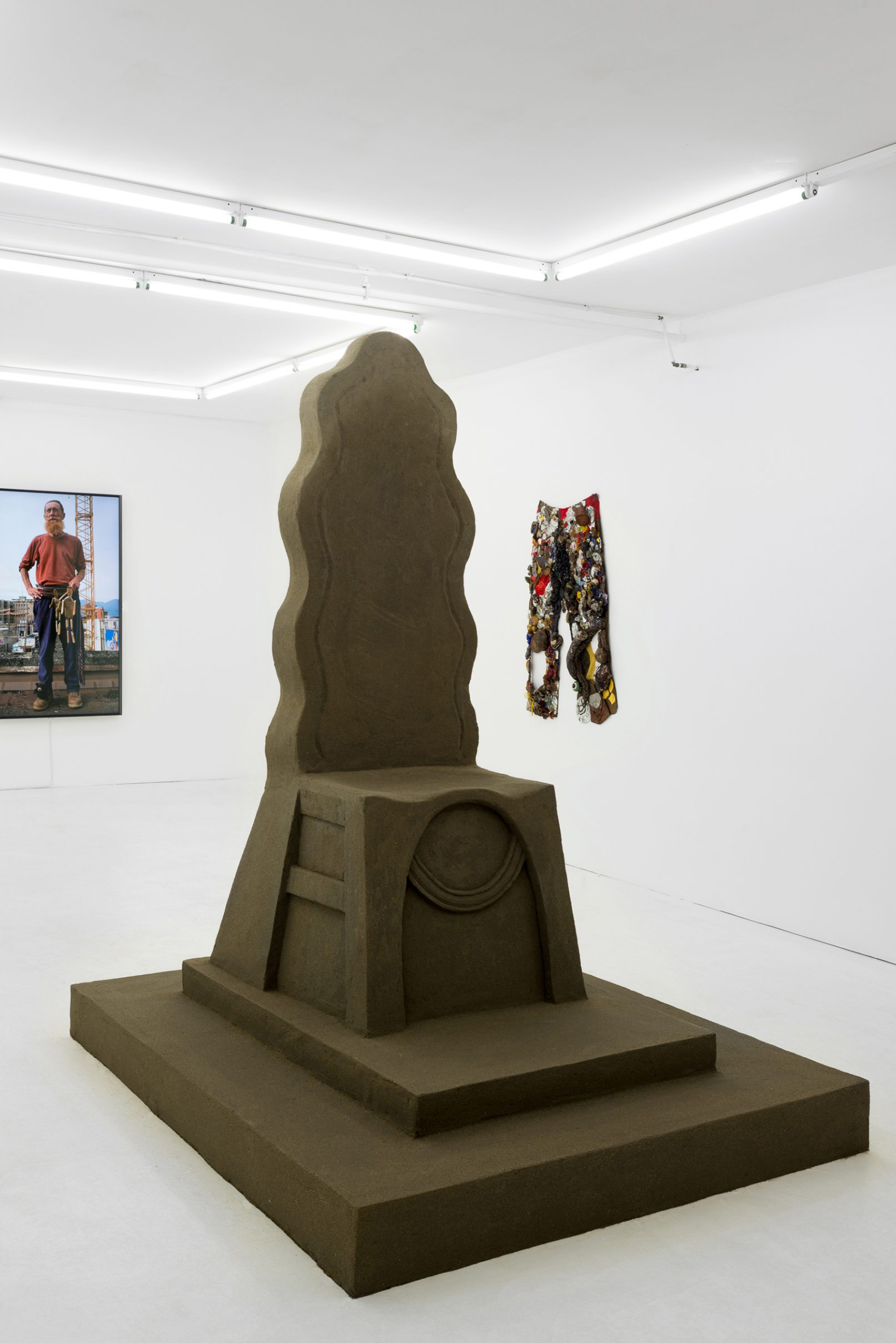 Wil Aballe Art Projects is pleased to announce its first exhibition with Matthew Shields. The exhibition includes a throne sculpted from sand, five assemblages constructed on pants and a video titled, Tim (2015). The video, presented on a flatscreen monitor, is a life scale portrait of an older man standing on an urban rooftop singing songs and handling wooden puppets. The songs are traditional doggerel, full of obscenities, grotesque imagery and political protest.