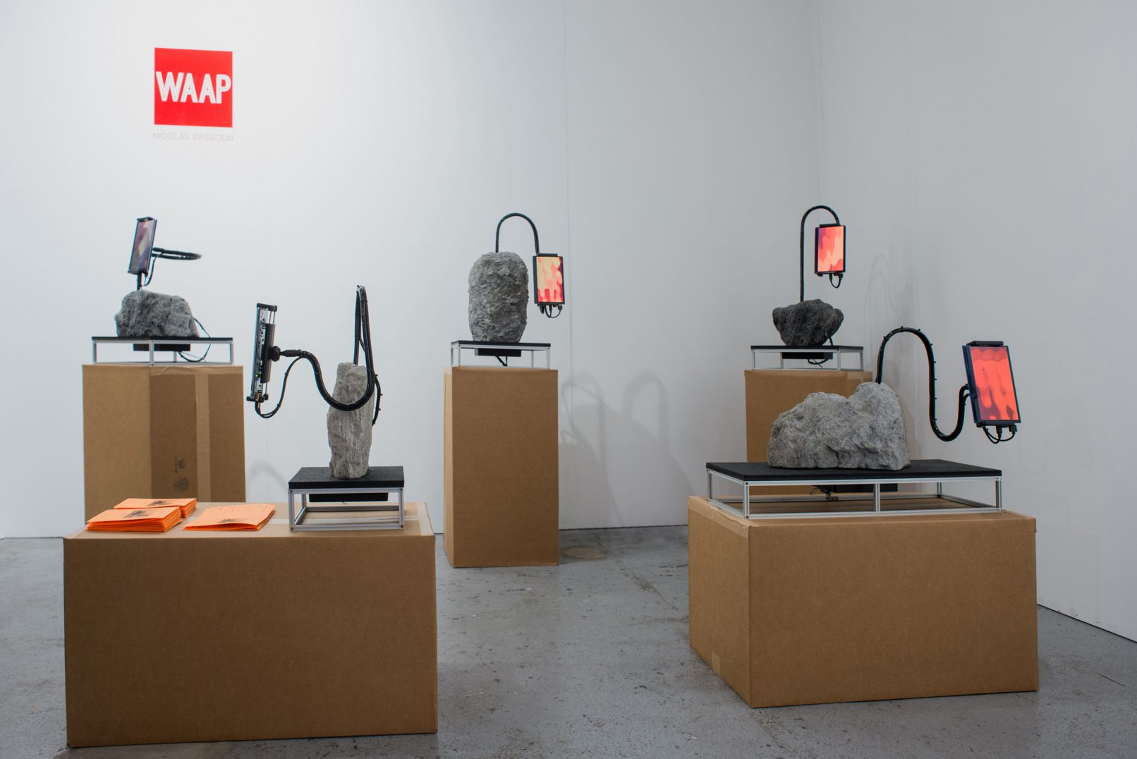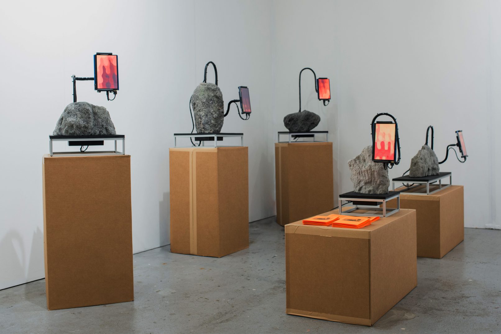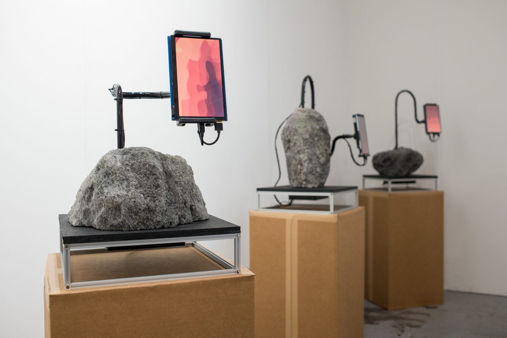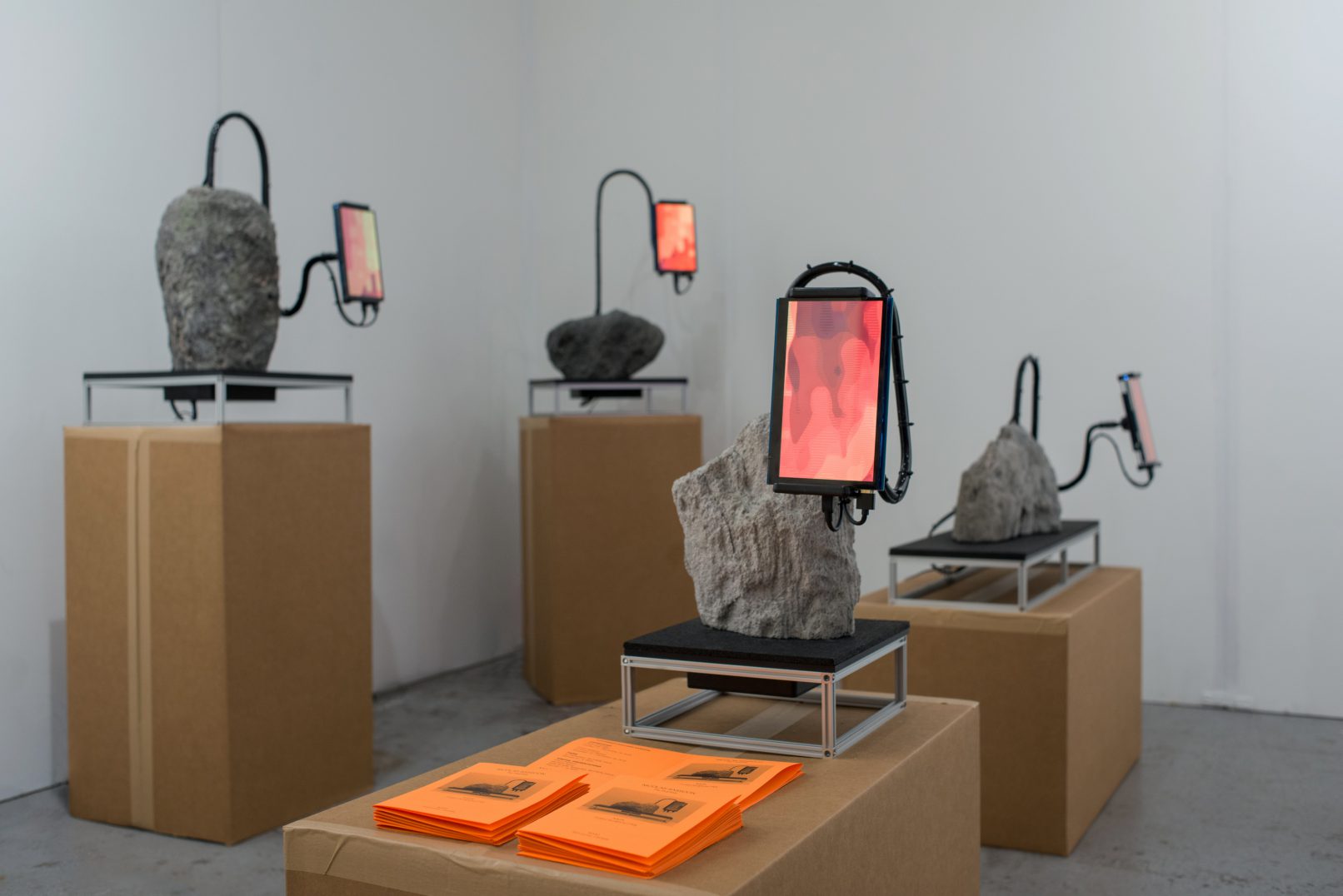 Exploring this resource extraction and environmental impact required for us to use our devices to live networked lives, Sassoon’s The Prophets asks us to think about rocks and other planetary matter as media and lively forces communicating with us across time. In his newest series of work, Sassoon recounts a partial history of our relation with matter — a speculative geology of our digital condition. Here Sassoon brings together volcanically produced pumice stones into conversation with electronic hardware and LCD screens. Seemingly frozen in time, these pumice stones are unstructured and irregular, full of lobes, cracks, crevasses and voids. Together with vestiges of our digital technology gained from rare earth metals, Sassoon has produced new assemblages that juxtapose human and geological time.