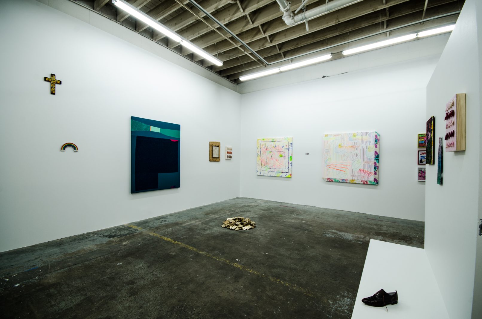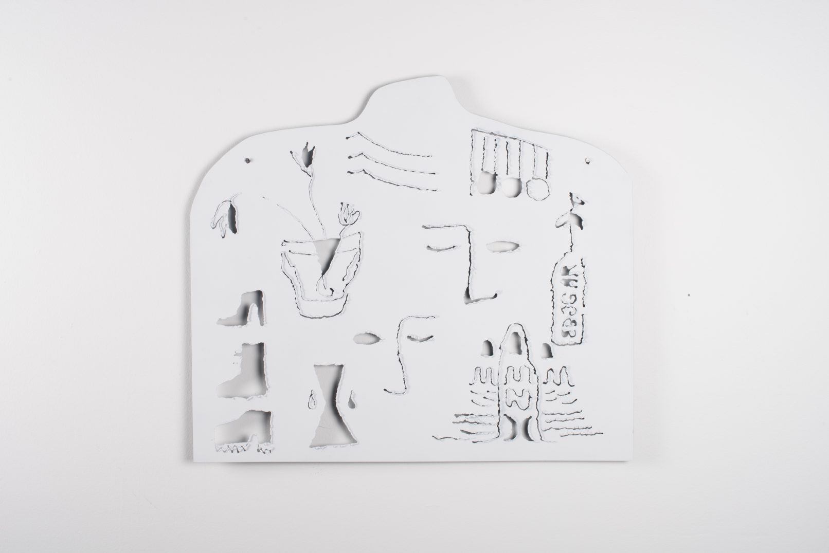 Other works critically assess the aesthetic contexts in which objects are situated. ROULA PARTHENIOU’s sculptures make overt references to commonplace things, but their operations are far more subtle; for they rely on their audience’s acquired familiarity with consumer culture in order for their representations to be seen. JASON MCLEAN’s collaborative sculpture with SCOTT LAWRENCE functions cleverly as a visual double entendre. VANESSA BROWN’s flat panels fuse picture and sculpture, with the obj ects depicted in them derived surrealistically from dream-activated visual fields. BARRY DOUPE explores the various forms “a line” can take, and how its elasticity and transformability can be employed to express a vast range of emotional states.