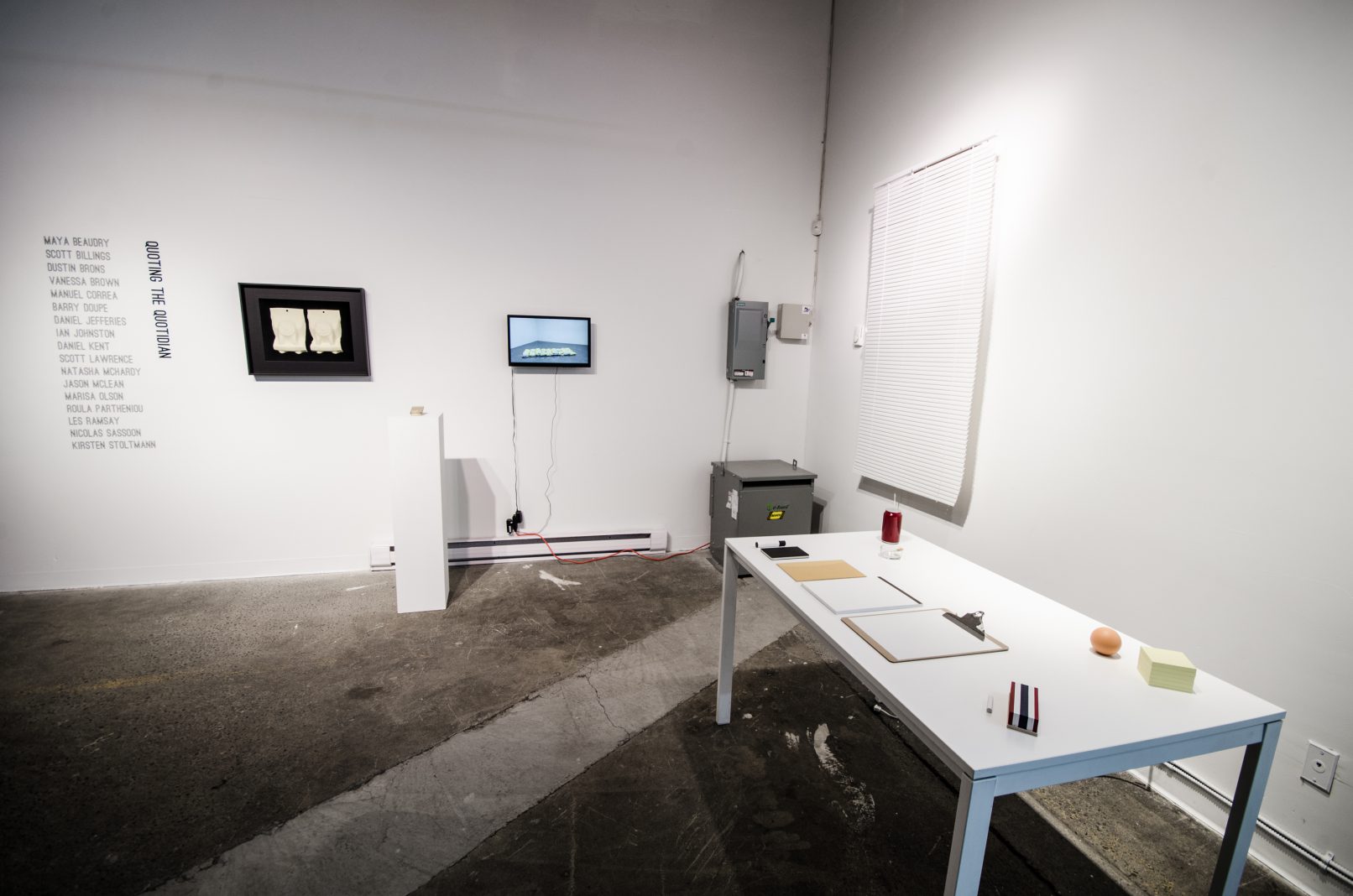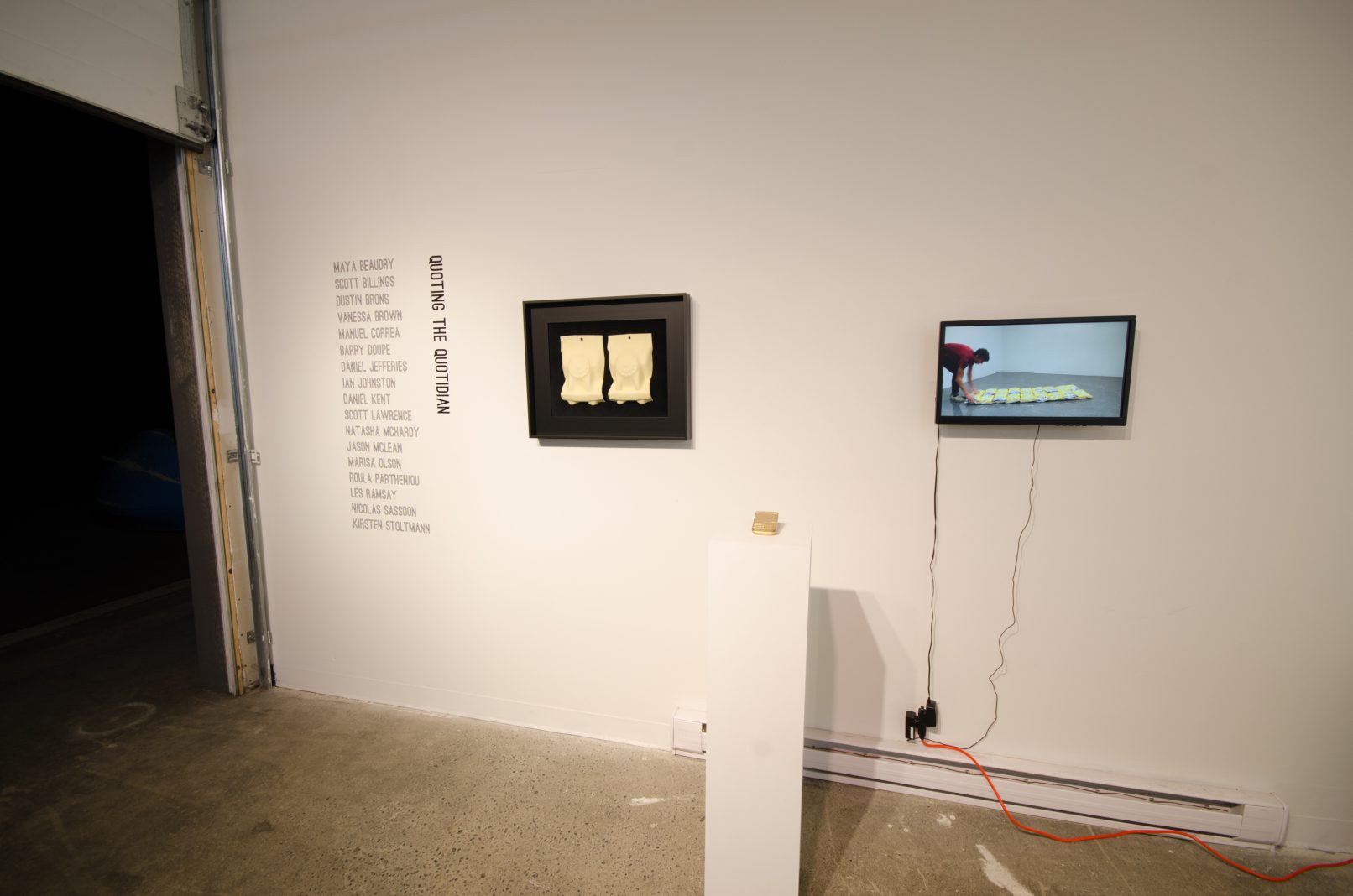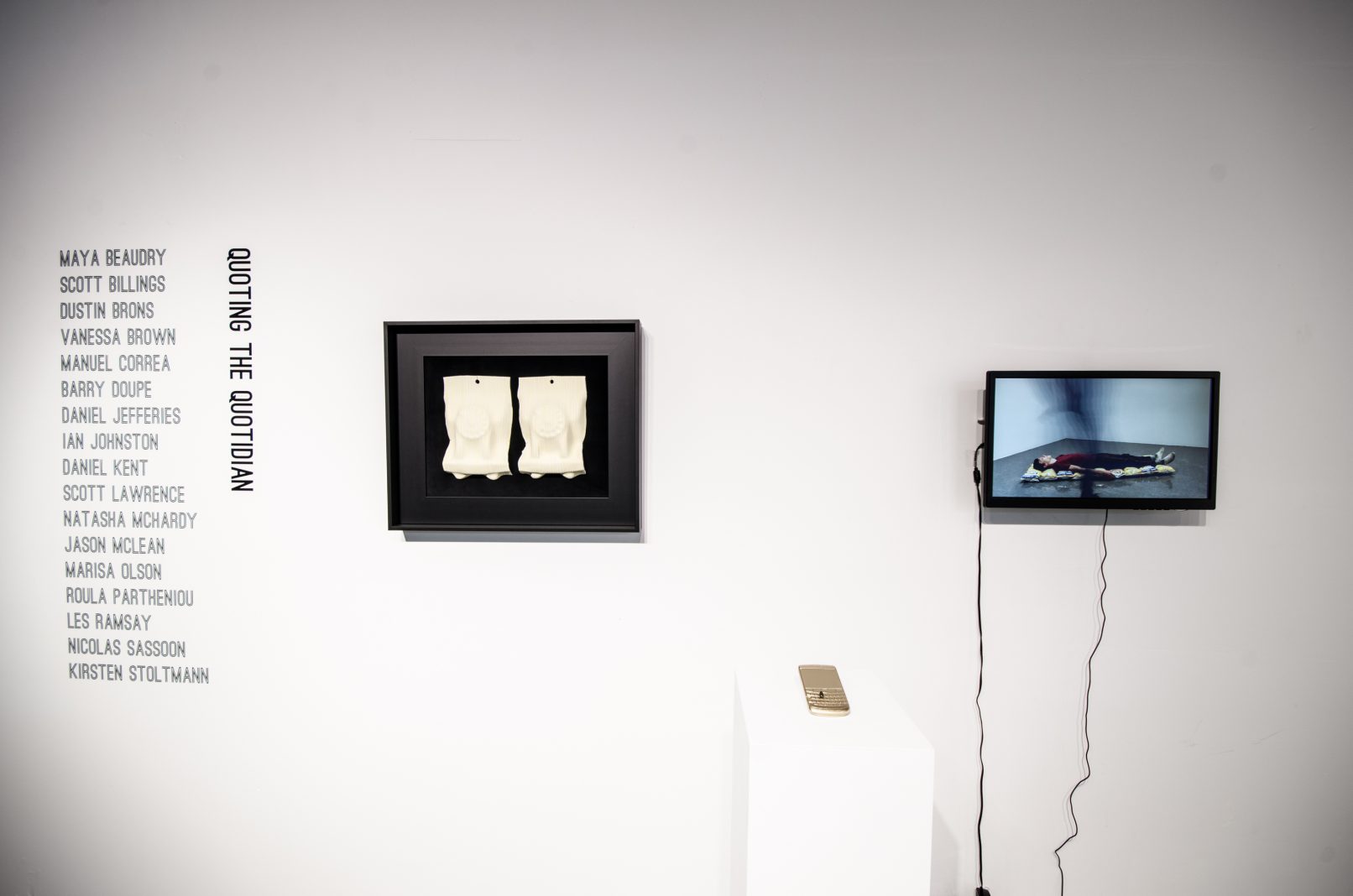 This is the crux of Quoting the Quotidian: while every work stands on its own, its positioning in the space and its proximity to other works effects an environment where the dialogues between the artworks is just as important as the discourses about and around them. And while the show includes myriad media and approaches, all the works relate to the idea of the quotidian – those meanings and rituals inscribed in society’s customs and culture.
